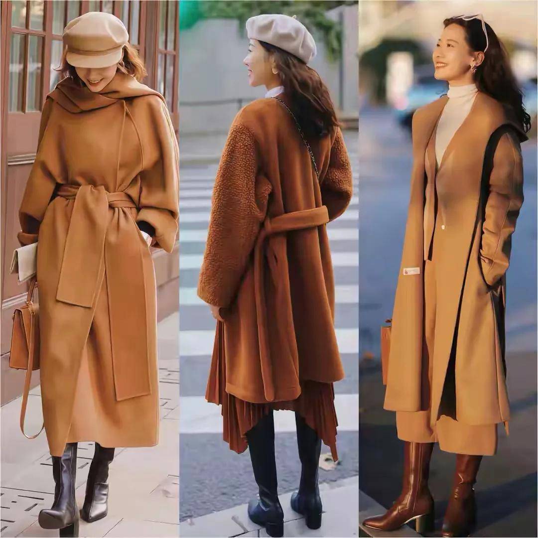 Tips①:驼色长筒靴搭配基础色大衣和裙子,打破冬季沉闷感