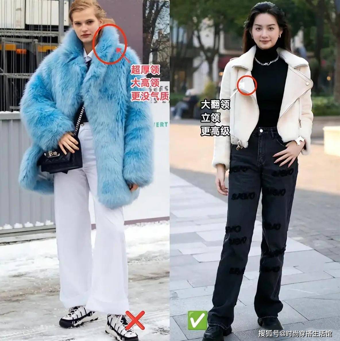 最后我们可以看到街拍中的时髦精为什么能够将羊羔毛穿得那么高级有气质呢?最关键的一点就是要选对合适的领口,毕竟领口太厚、太高的款式,容易将我们的脖子全部遮挡起来,从而出现脖子短、粗的现象,这样的搭配方式看起来毫无气质可言,那么最好的方式就是选择大翻领、立领等之类的大领口,这样才能更好凸显出颈部线条,显瘦显脖子长。