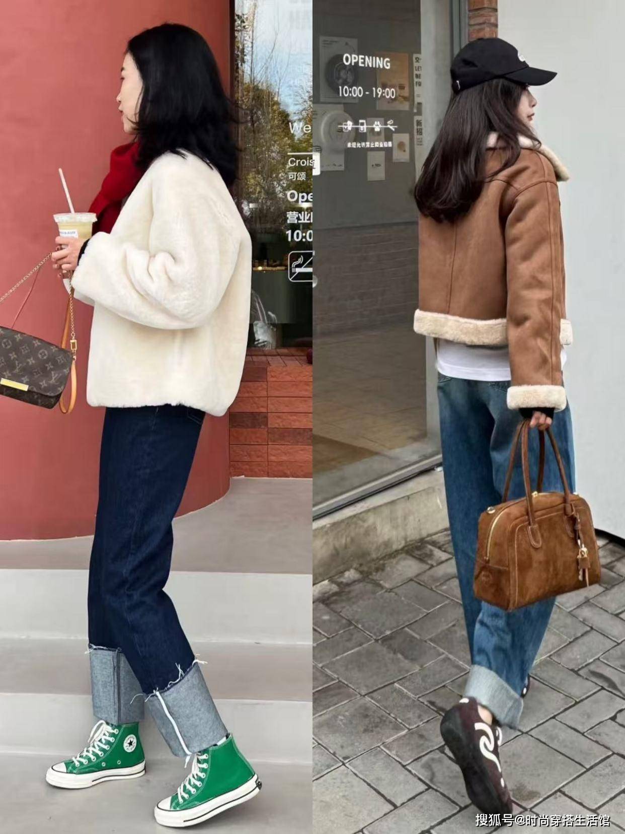 对于冬天来说我们选择穿长款羊羔毛确实非常的厚实和保暖,但对于小个子女性来说选择长外套会担心压低个子的现象,这时候的我们选择穿短款或者中长款会更加的合适,能够有效的遮挡住下半身的肉肉,搭配上直筒裤完美的修饰腿部线条,像是腿粗、腿型不完美的女性来说我们选择穿直筒裤不仅可以遮肉显瘦,同时还能拉长比例线条,此外选择牛仔材质会更加的防风和保暖,轻松就塑造出高级感。