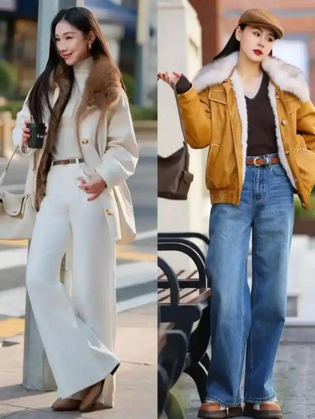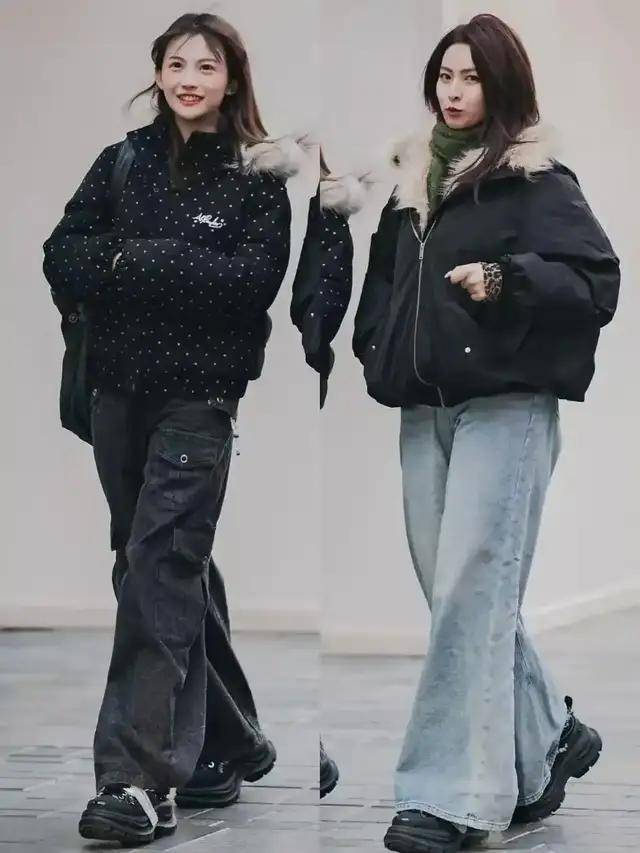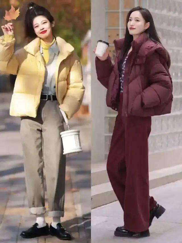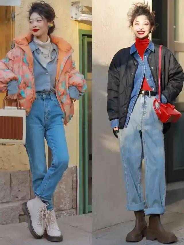 例如上面用短羽绒服或者是小香风外套,搭配上牛仔直筒阔腿裤,脚穿一双粗跟单鞋或者是驼色的乐福鞋、雪地靴,就能使得穿搭者精致时髦。