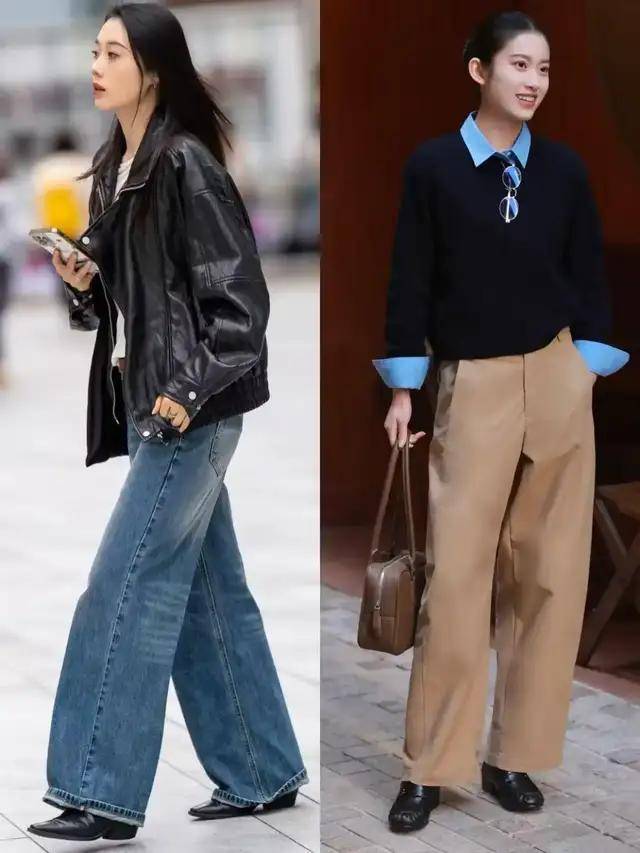 想让自己的打扮比较酷的情况下,还可以选择黑色的尖头皮鞋或者是圆头皮鞋来搭配上牛仔阔腿裤,卡其色的西装裤,这样的穿衣打扮通勤时髦,很适合职场女性。