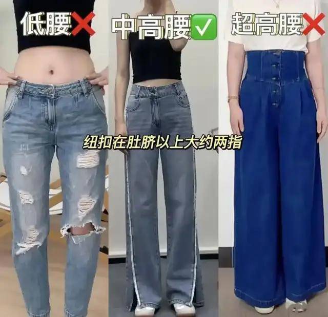 同样是裤子,但是高腰、低腰、中腰穿在身上是完全不一样的。正常情况下来说,普通大众女性不要选择低腰的裤子,也不要选择超高腰的阔腿裤,选择中高腰的裤子版型最佳,纽扣在肚脐以上大约两指就行。