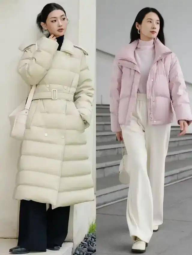 当你选择的是短羽绒服外套的时候,我们可以利用衣服的色差形成撞色。例如上图右边的这一套穿搭,浅紫色羽绒内搭浅紫色的针织毛衣和白色的休闲阔腿裤,色差比较明显,一眼看上去就知道腰线位置,这就是撞色的优势。