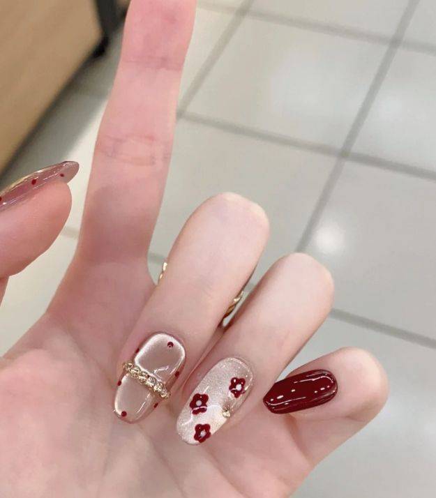 红色系仍是新年美甲的主流,但单一纯色已显单调。当前流行的做法是在深红或酒红底色上,以微透的豆沙红做渐变,再点缀少许金色魔镜粉勾边。