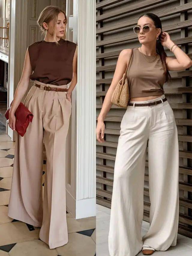 在南方城市天气比较暖和。我们可以选择用一件白色的修身款背心搭配上一条卡其色的阔腿长裤。这样的穿搭就属于松紧结合,不用你费心费力去搭配,就能呈现出凹凸有致的身材。