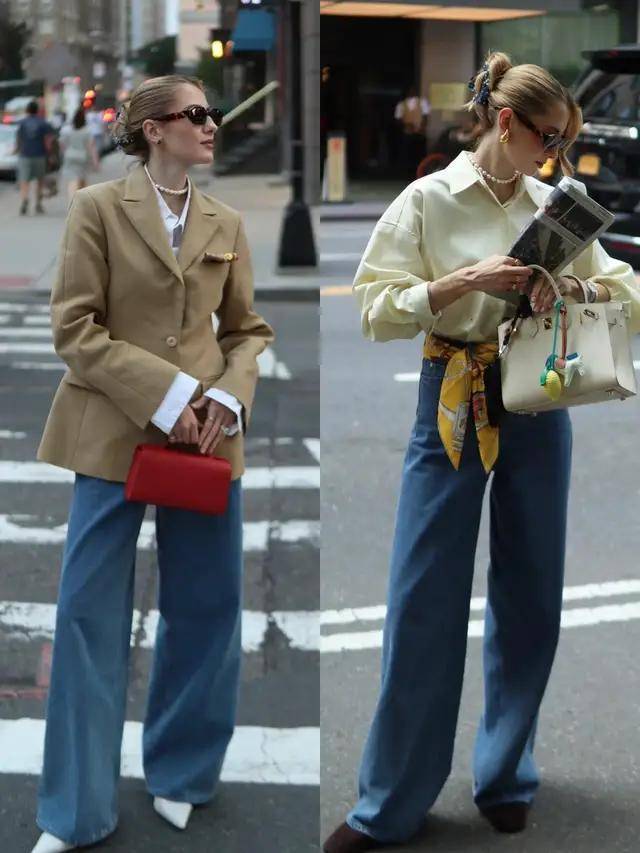或是选一件浅黄色的西装,内搭白 T 恤,加上牛仔阔腿裤,这样的衣服配色很自然地让穿搭者显白显嫩,干练又不失精致感。