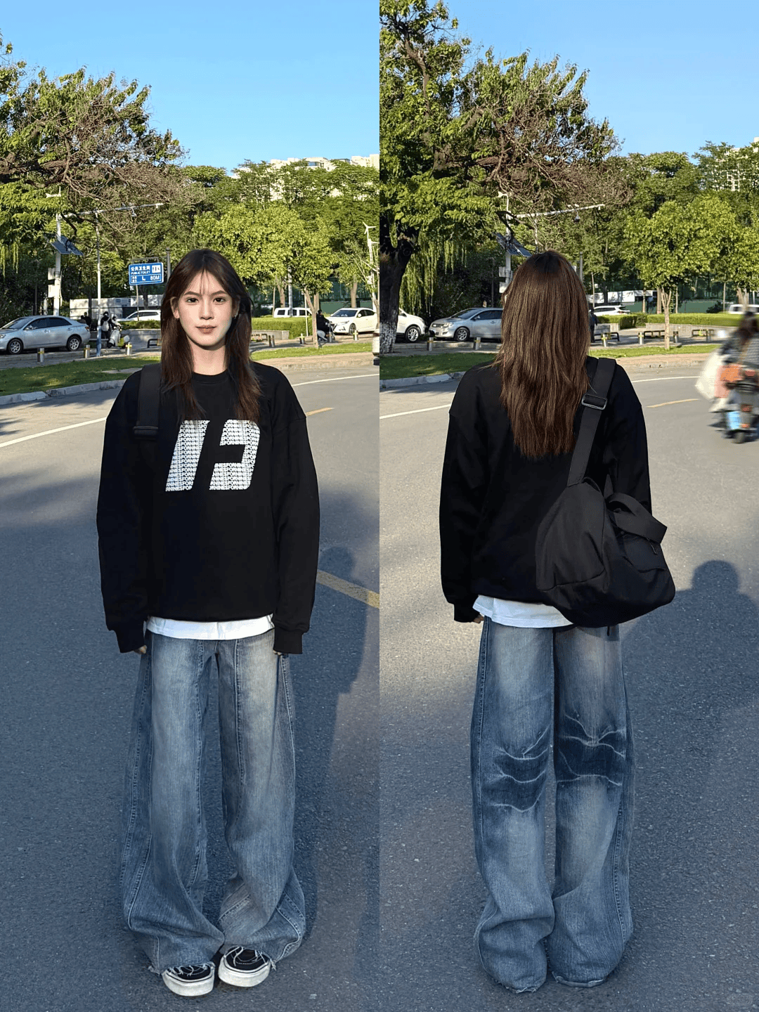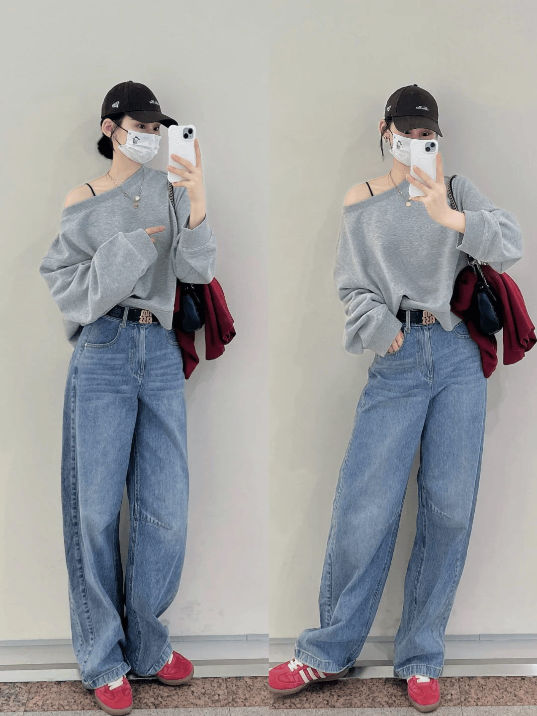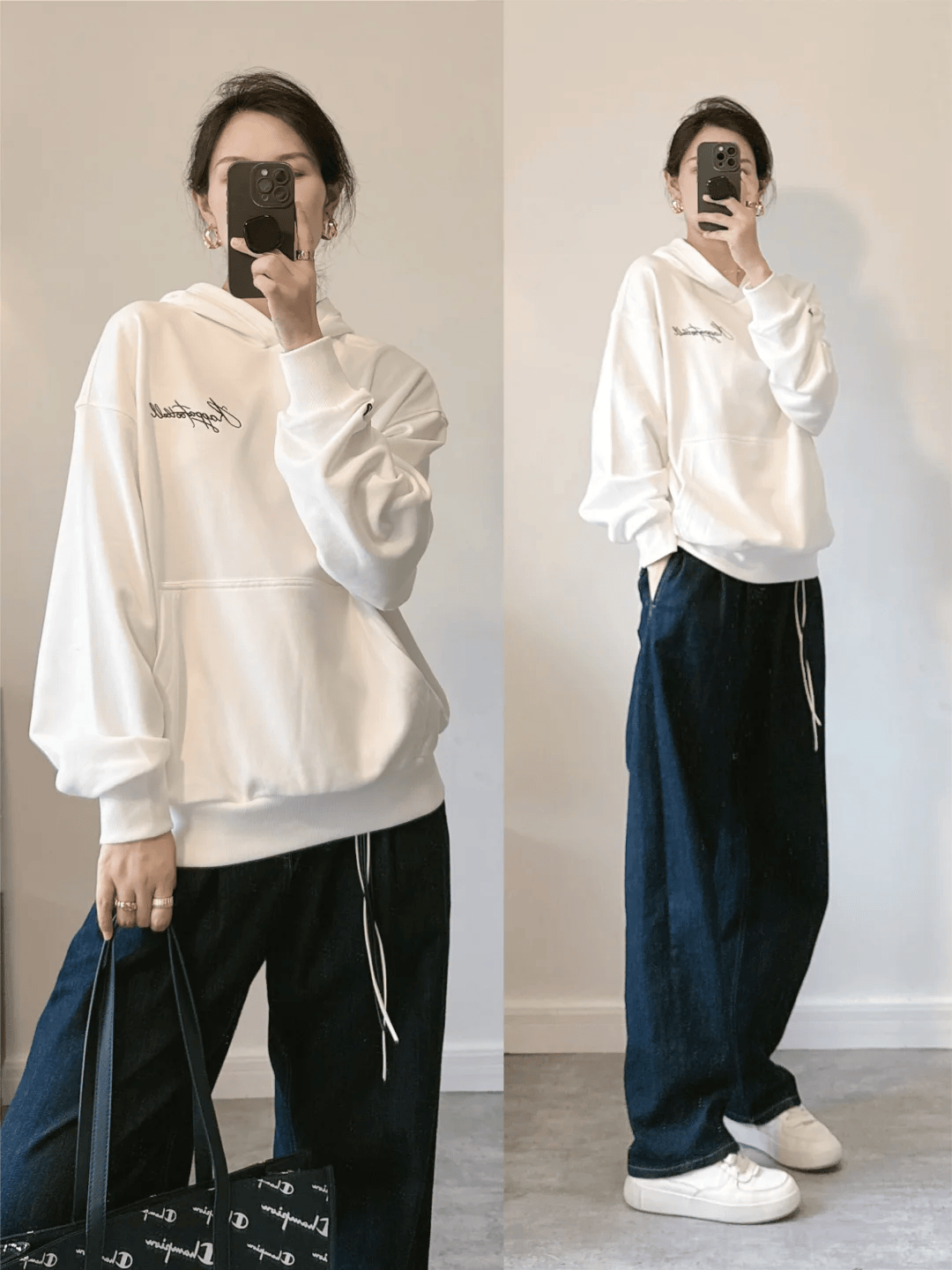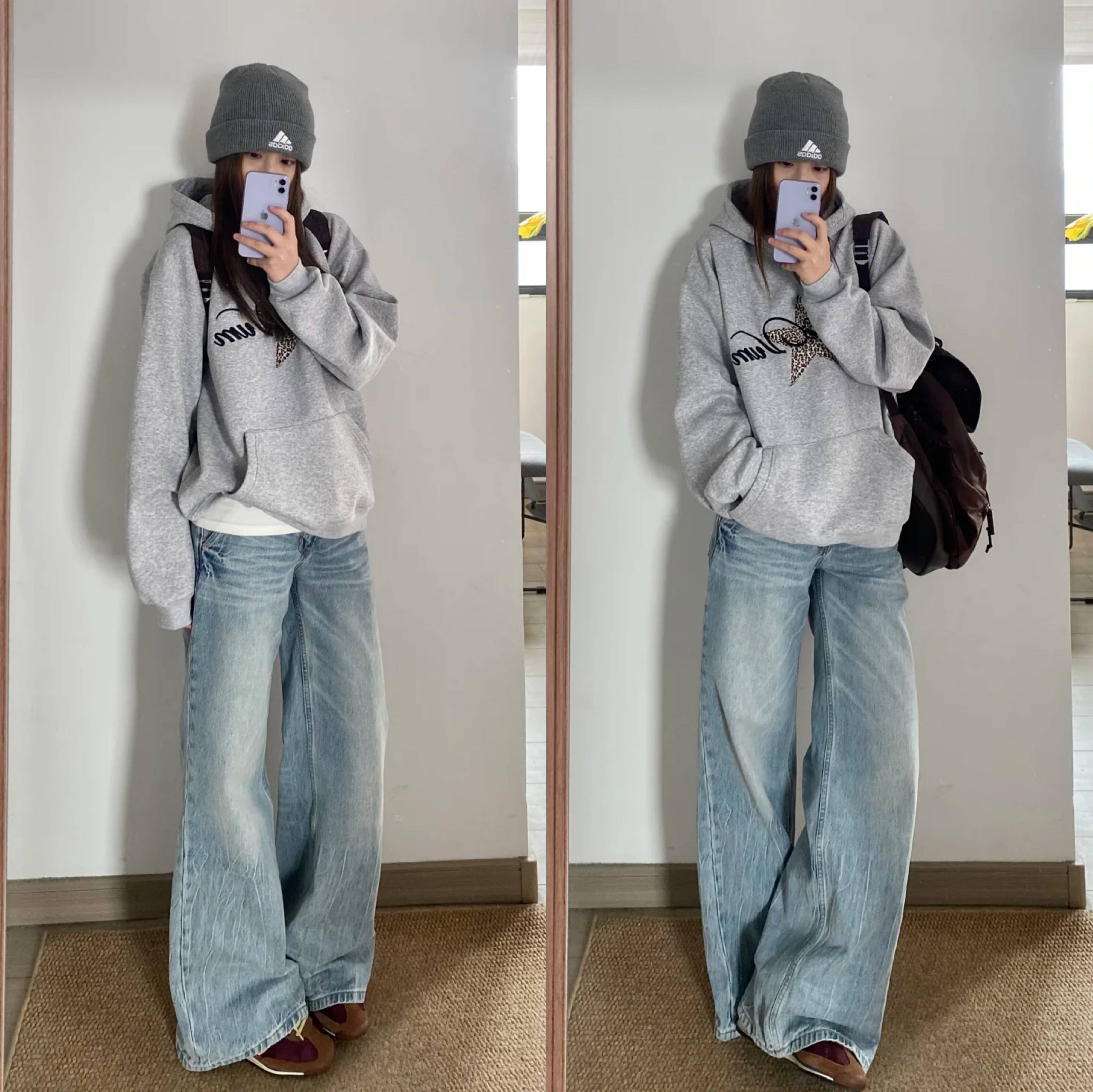 最适合打造休闲舒适风的,莫过于卫衣配牛仔阔腿裤了,灰色连帽卫衣,简约百搭且不易出错,可以选择带有印花刺绣的款式增加精致感,下半身选择水洗牛仔阔腿裤,浅蓝色低调且沉稳,与灰色卫衣组合不会显得太过突兀。