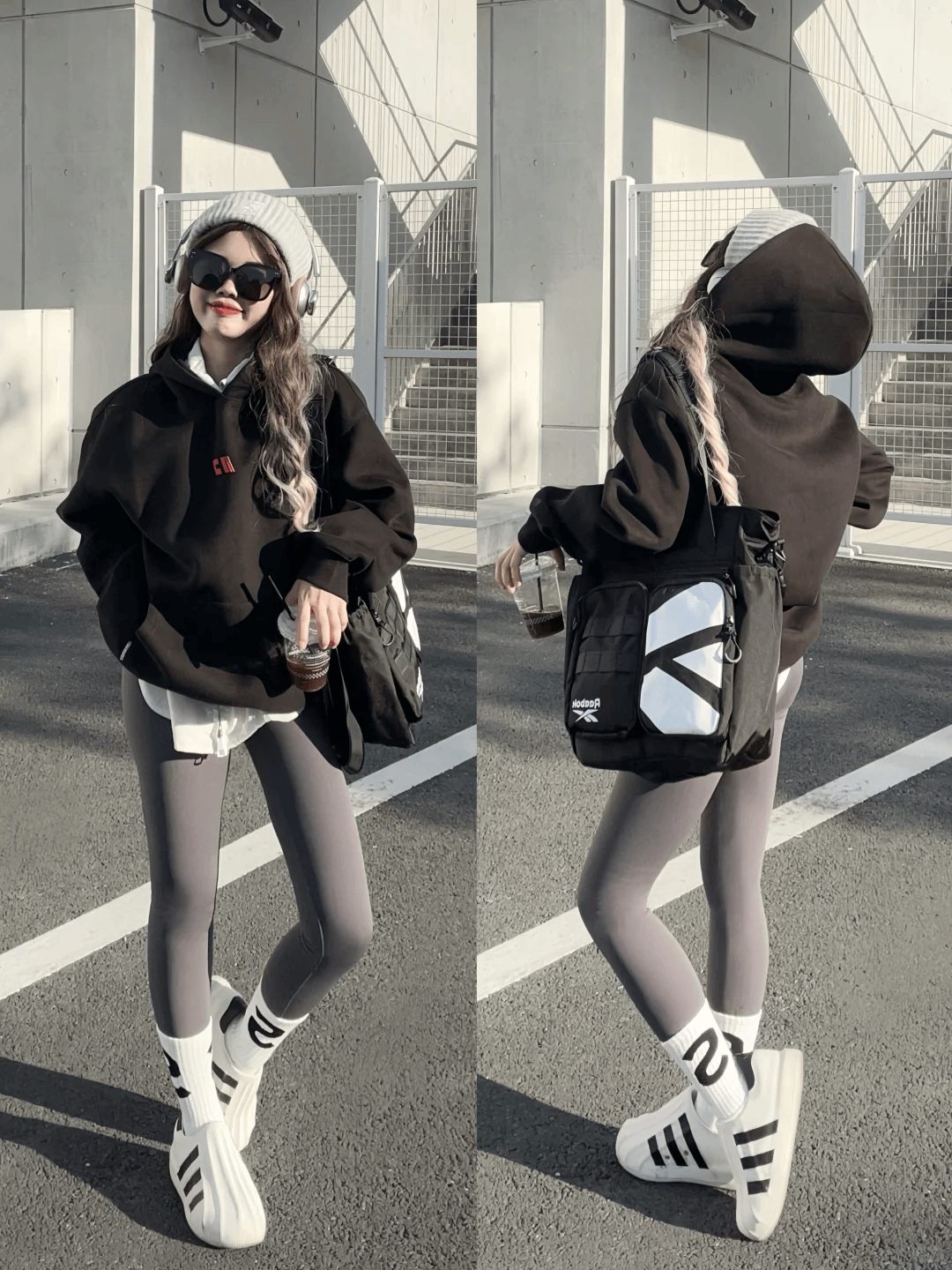 这种穿搭公式就是上宽下窄,尤其对于苹果型身材或者梨形身材的人来说,可以最大限度的扬长避短,卫衣的宽松版型可以藏肉,而瑜伽裤贴身的版型可以修饰腿型,对比之下可以通过收缩下半身来达到显瘦效果,可以选择大廓形的卫衣,或者叠穿衬衫/T恤,来遮住腰臀位置,效果会更好哦!
