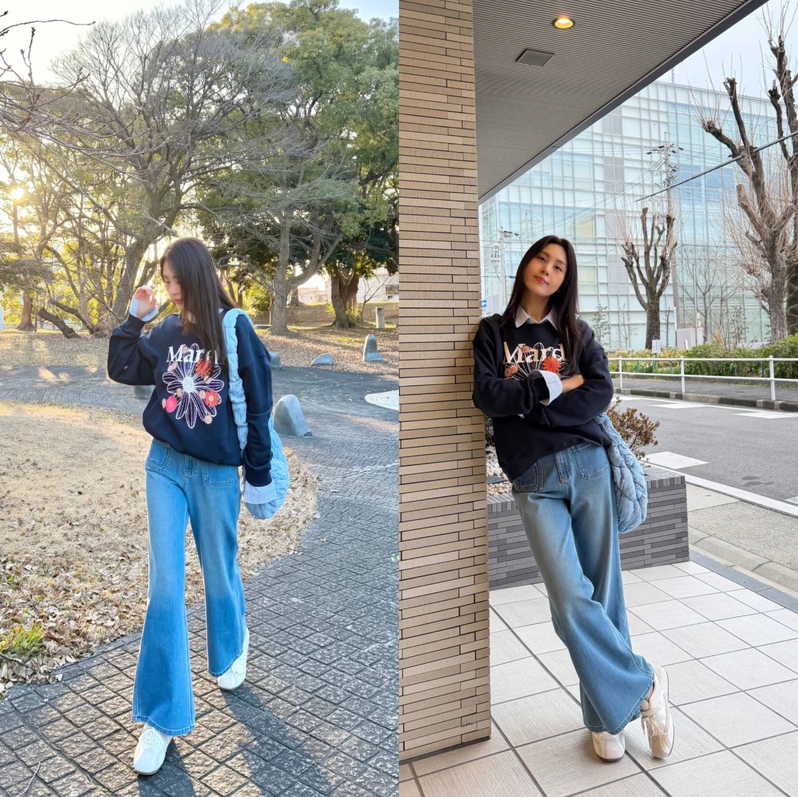 时髦个性的叠穿也非常适用于卫衣,深蓝色印花卫衣叠穿白衬衫,将衬衫的袖口与领口露出,增加穿搭的层次感,下半身衔接蓝色微喇牛仔裤+小白鞋,就可以打造休闲舒适的春季轻熟风穿搭。