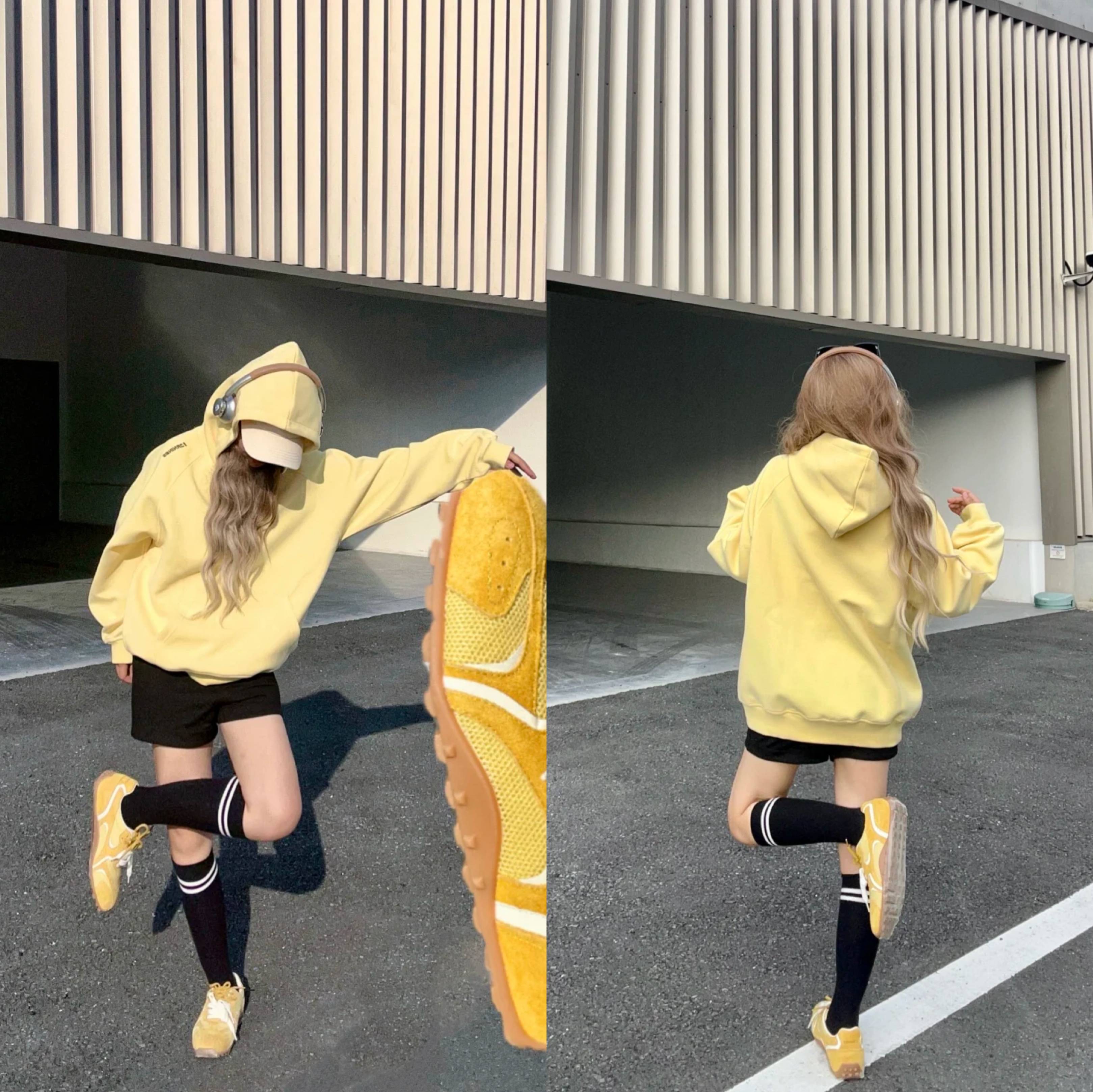 想要更时髦减龄,卫衣的颜色选择可以偏向彩色系,比如黄色连帽卫衣,用黑色短裤来压制视觉冲击感,黑色长筒袜修饰腿型,搭配黄色德训鞋来进行色彩呼应,整体造型非常完美。