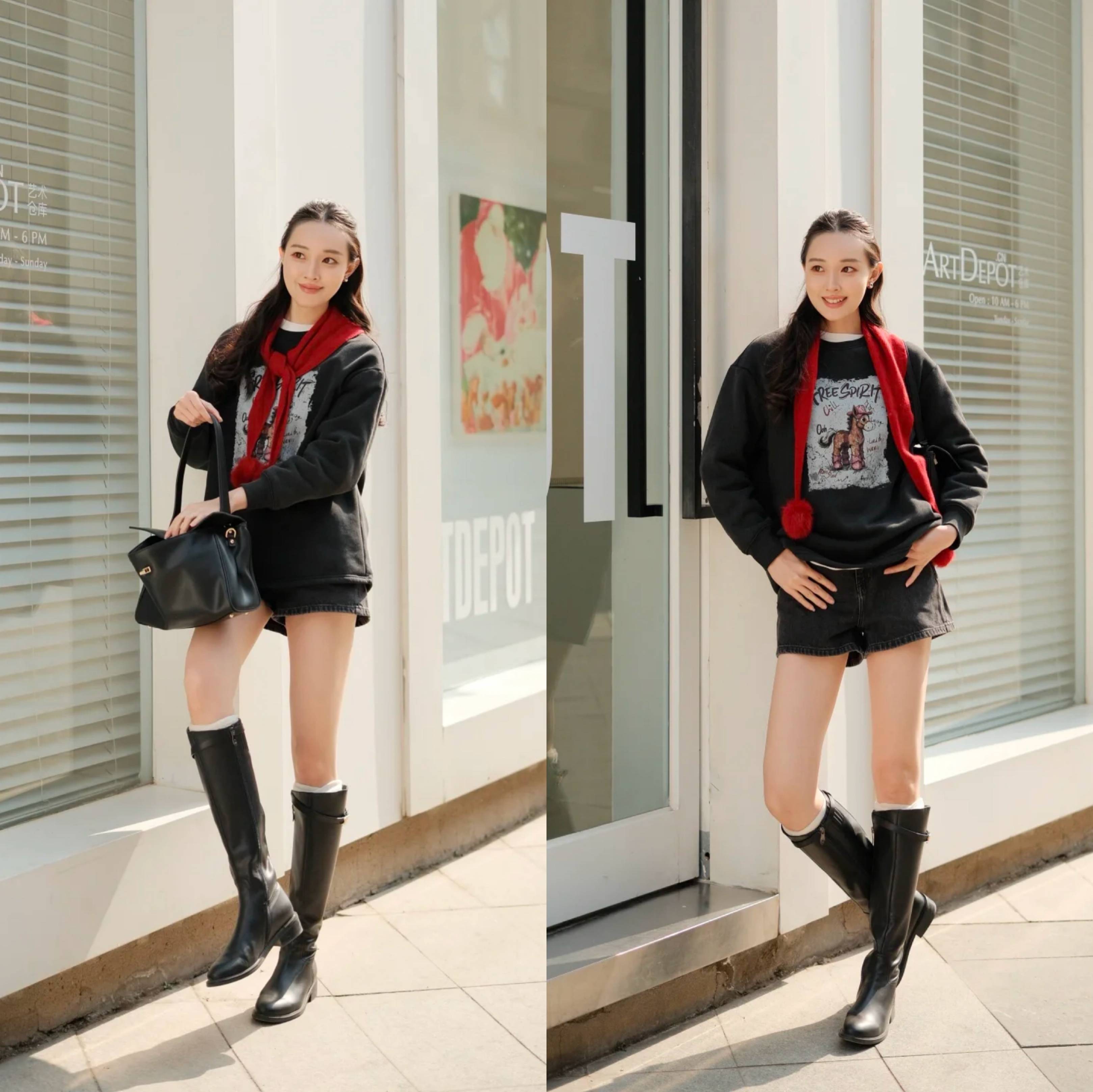春季怎能少了露腿穿搭呢!黑色印花卫衣搭配黑色短裤,再配一双黑色长筒靴,通体黑色搭配,加上适当的露腿,既能显瘦又能显腿长。