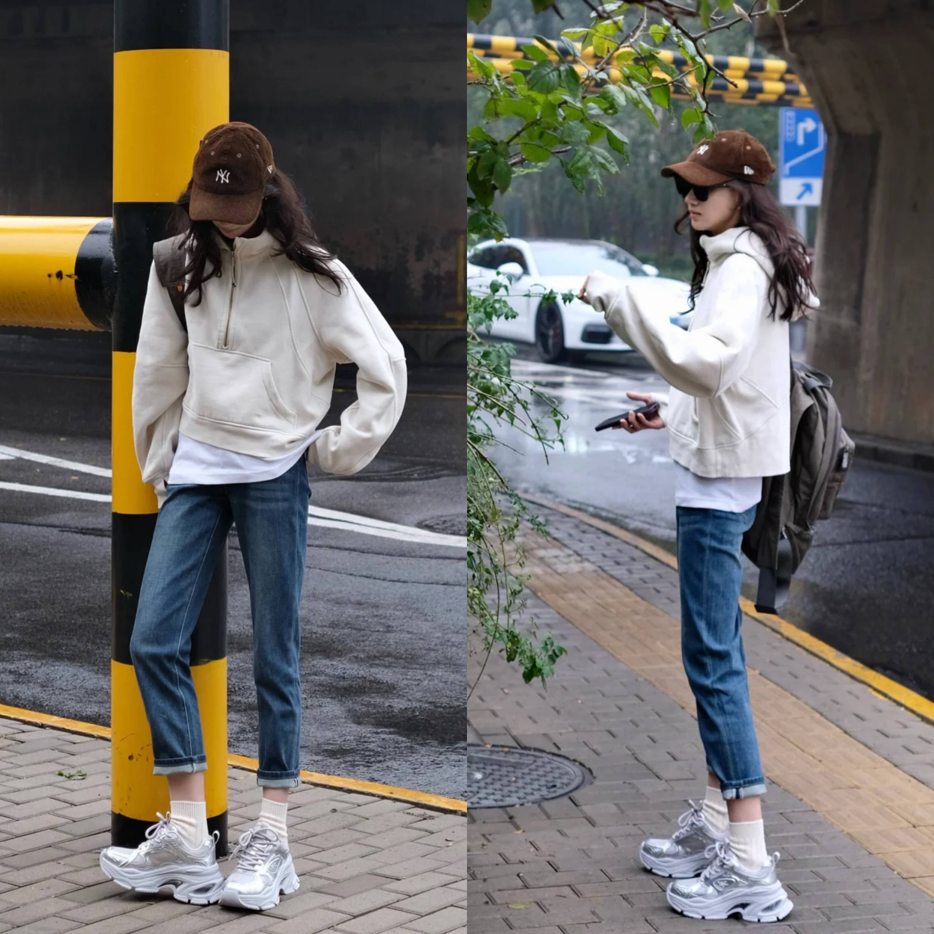 也可以选择短款的大廓形卫衣叠穿白色T恤,这种搭配既可以突出高腰线,又能藏肉,非常实用,下半身选择九分烟管牛仔裤搭配老爹运动鞋即可。