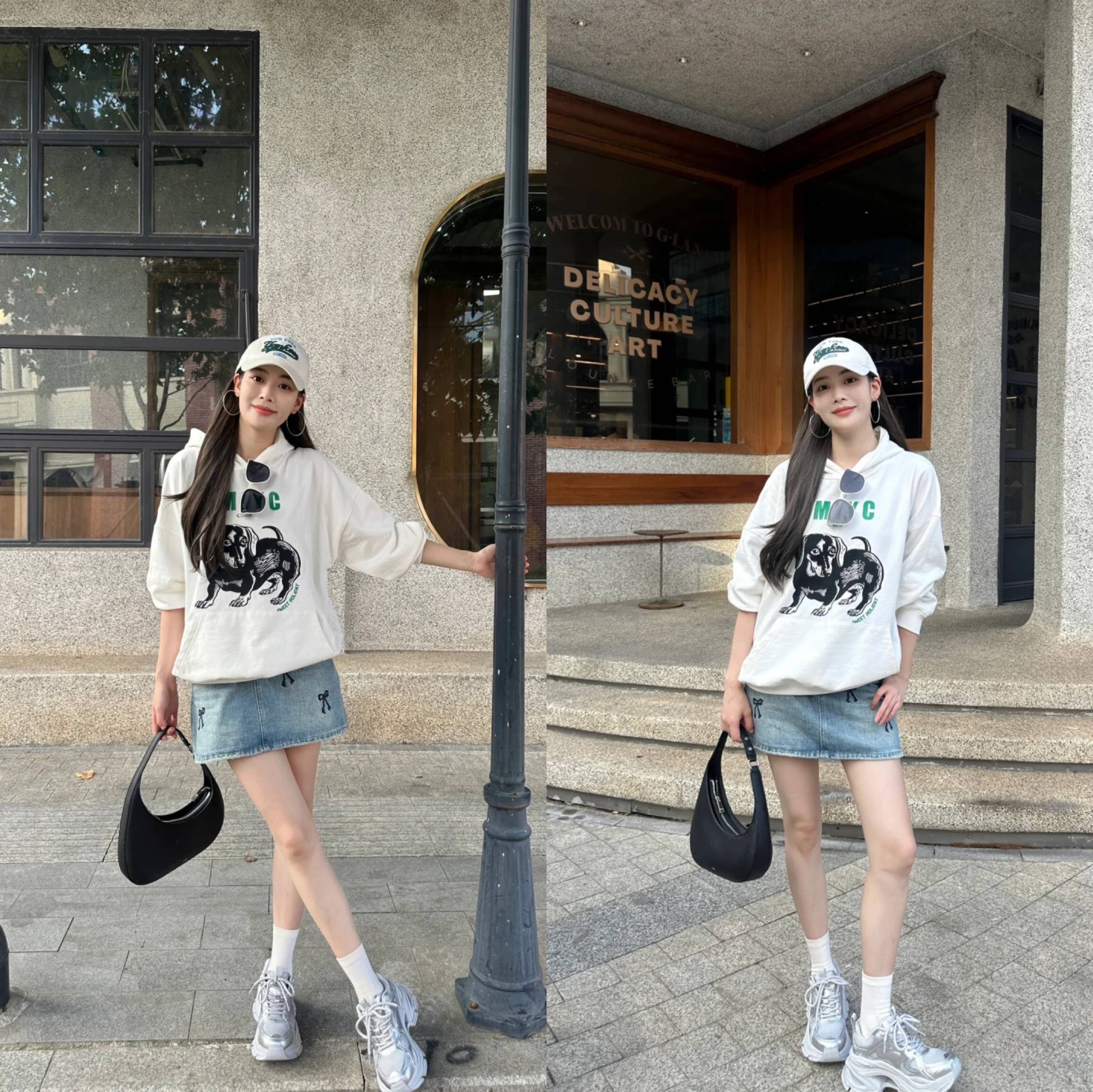 另外,牛仔短裙也是卫衣搭配的好伙伴,白色连帽卫衣,黑色印花图案,配合浅蓝色刺绣牛仔短裙,打造春季休闲舒适又不失小性感的轻熟风穿搭。
