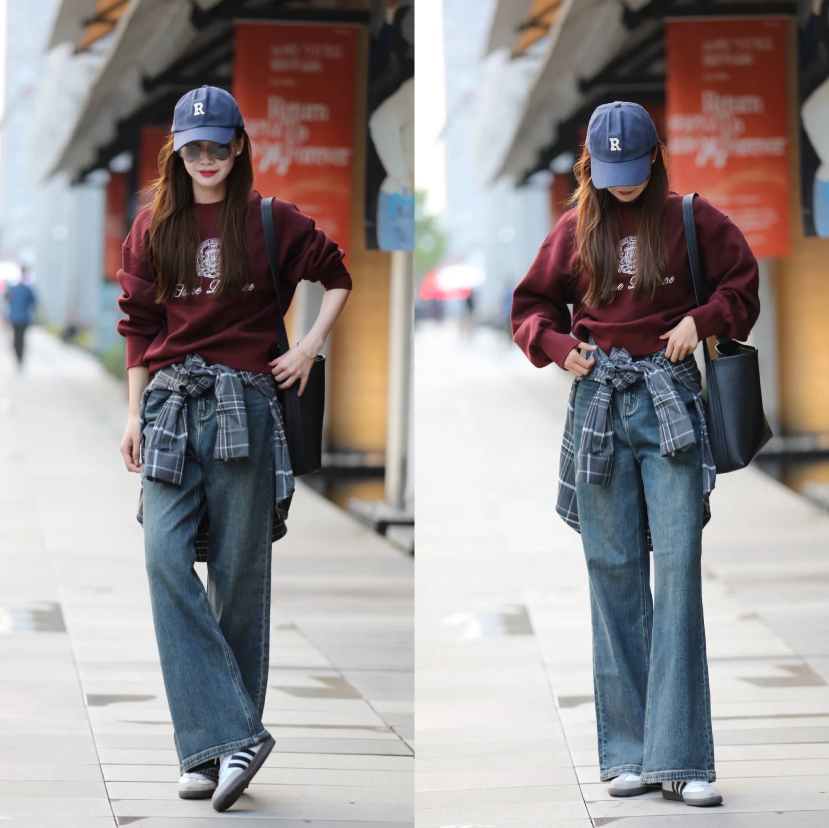 作为百搭的个性单品,卫衣与牛仔裤的组合还可以利用不一样的搭配来诠释个性,比如暗红色圆领卫衣搭配微喇牛仔裤,在腰间系上一件格子衬衫,既有很好的遮肉效果,又能打造时髦个性,尤其是腰臀部偏胖的苹果型身材,非常适合这种穿搭,真的超级显瘦。