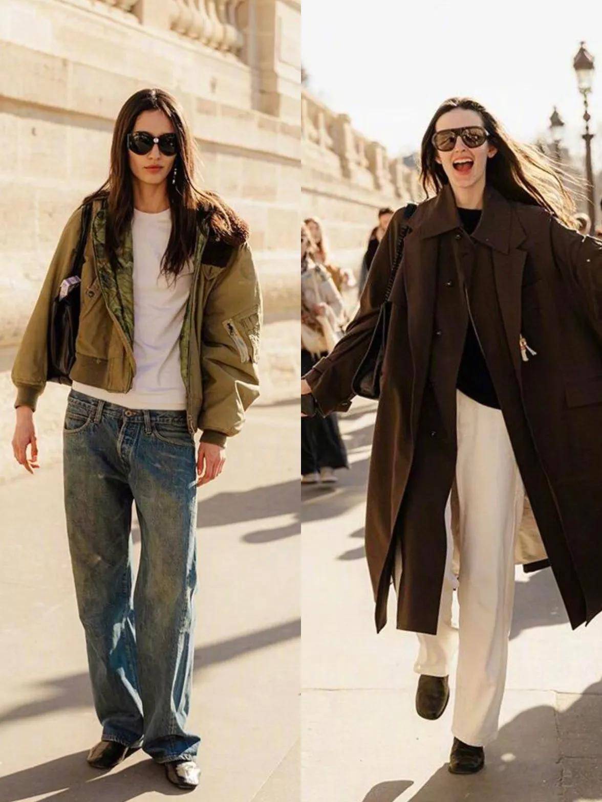 还不如直接选择简简单单的白色直筒西裤,配上一件棕色风衣外套来得清爽实在。