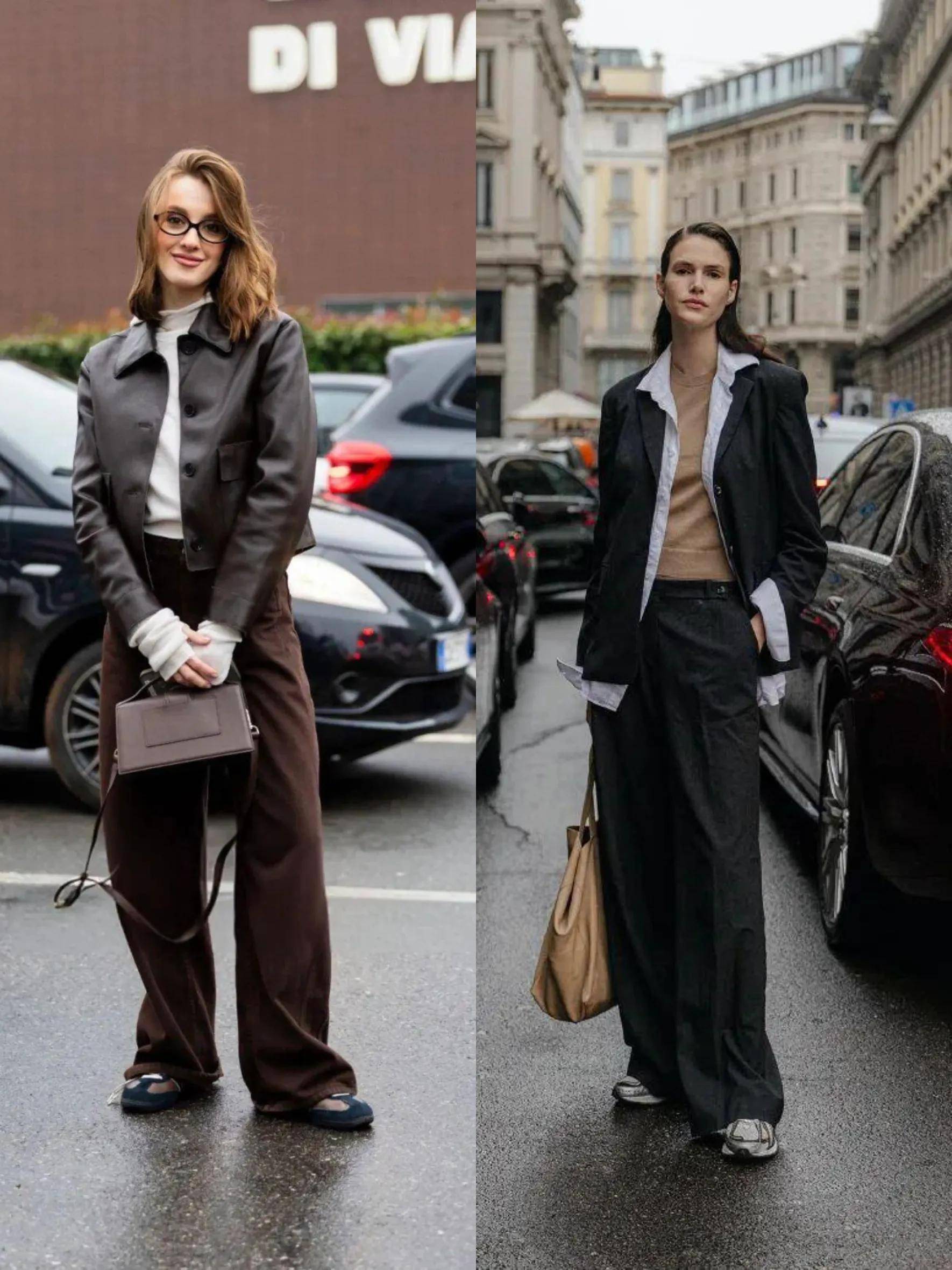 例如上面这一条灰色的西装直筒阔腿裤,配上一件深灰色的西服外套,内搭白衬衫,叠穿针织打底衫,既慵懒又干练。