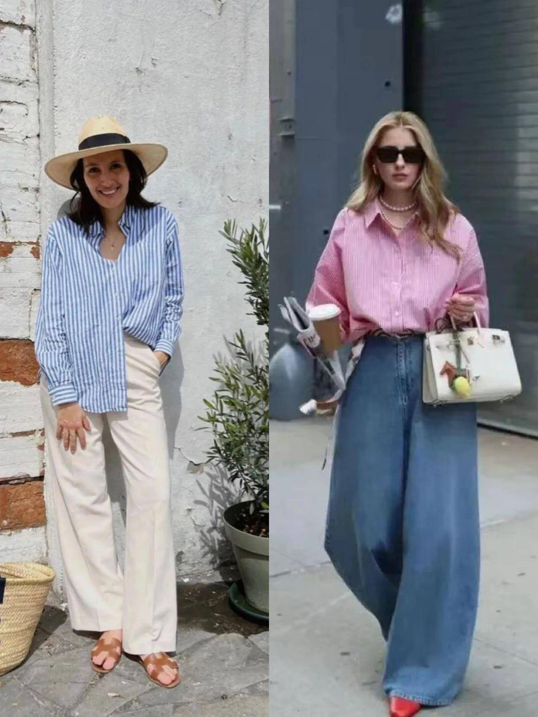 若是梨形身材的女生,这时候选择裤子就发生一定的改变了。我们选择细条纹粉色衬衫配上蓝色牛仔阔腿裤,这样才能更好地遮住胯宽腿粗等问题,同时又有一种慵懒随性的气场。让你轻松拿捏春季的氛围感。
