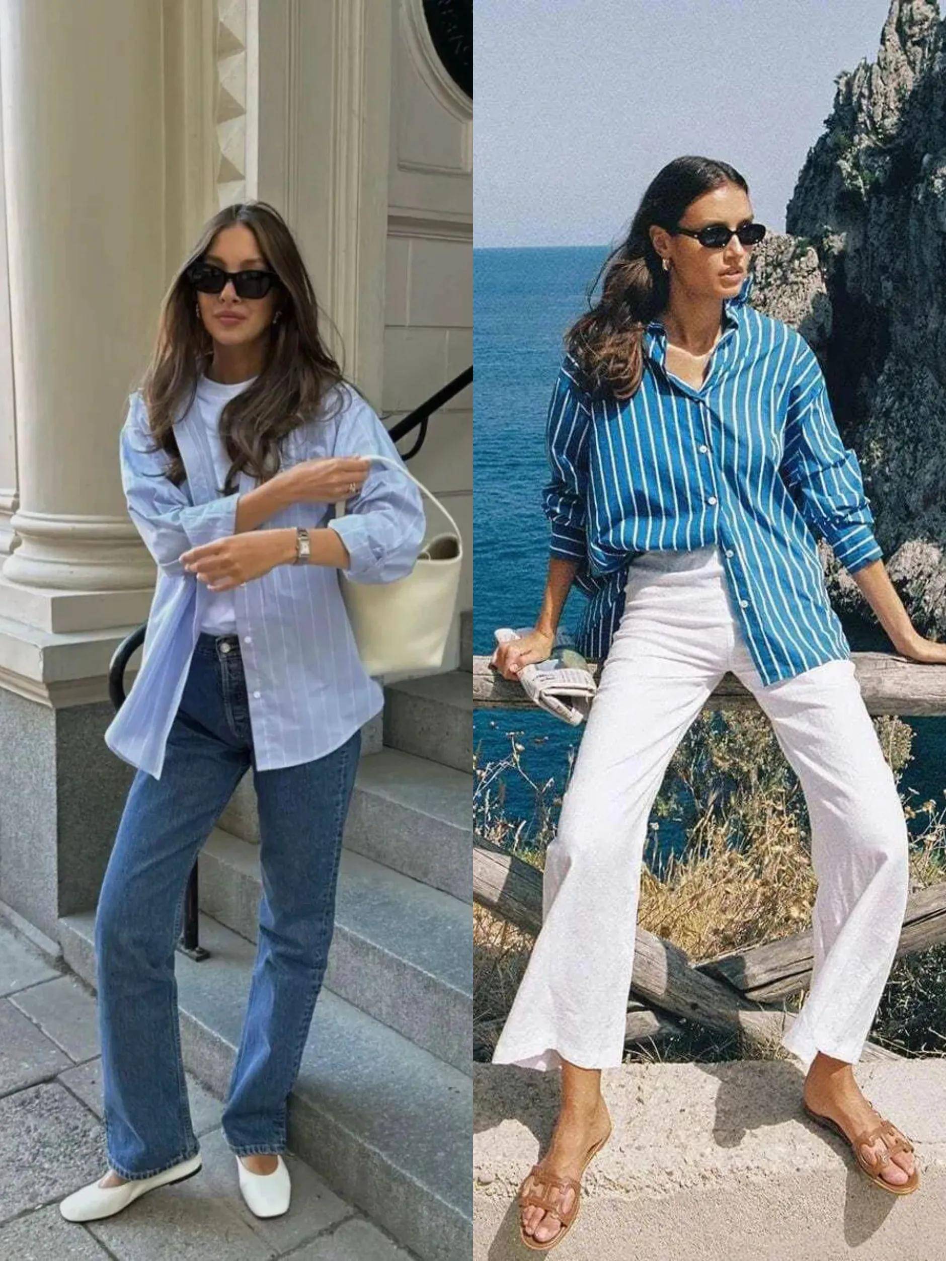 条纹衬衫穿在身上能解决穿衣打扮过于单调问题,竖条纹的衬衫还能让人显瘦,不同的色调穿搭有着不一样的时尚感,例如用雾霾蓝的条纹衬衫配上蓝色牛仔裤,简约通勤时髦。