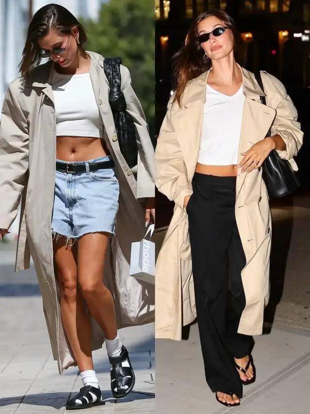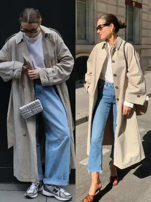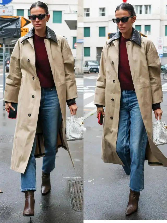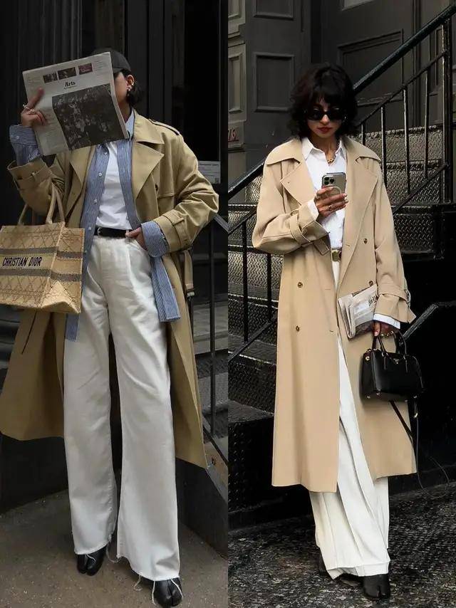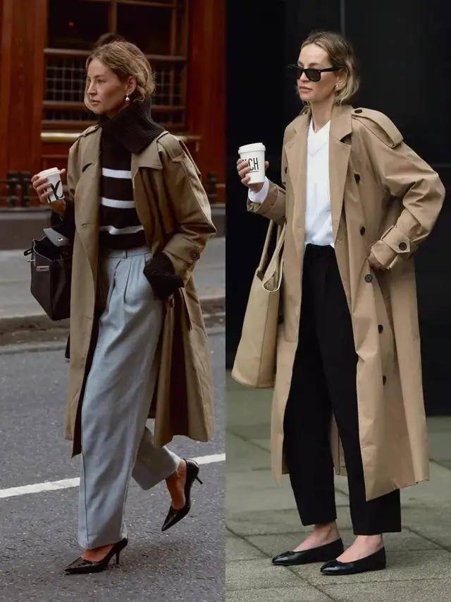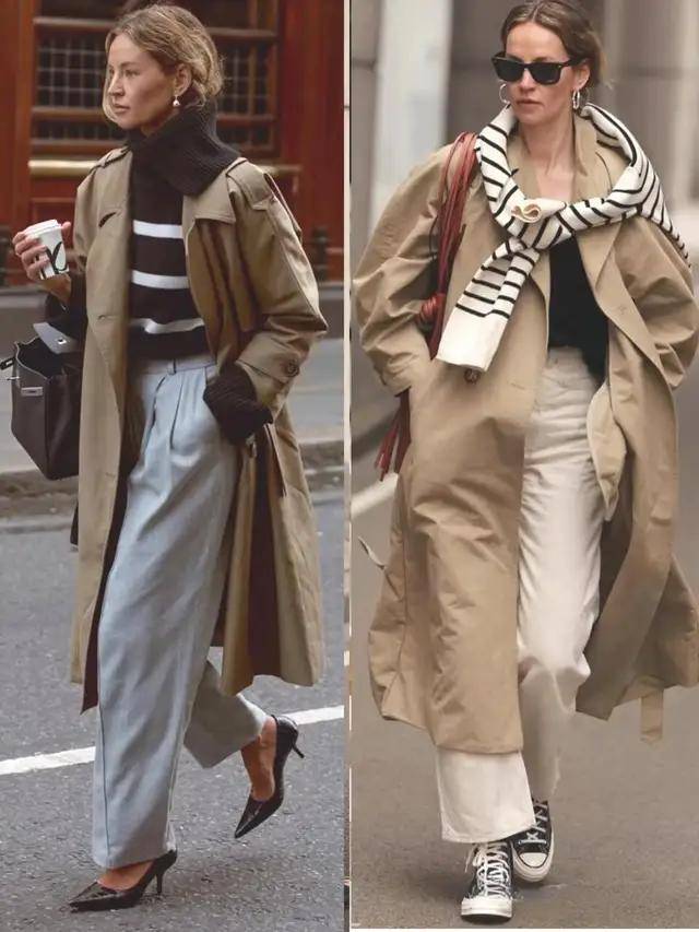风衣的款式版型很相近,但造型的气质却藏在穿搭细节里,换成一双尖头高跟鞋,便能悄悄拉长腿部线条,利落又有气场。