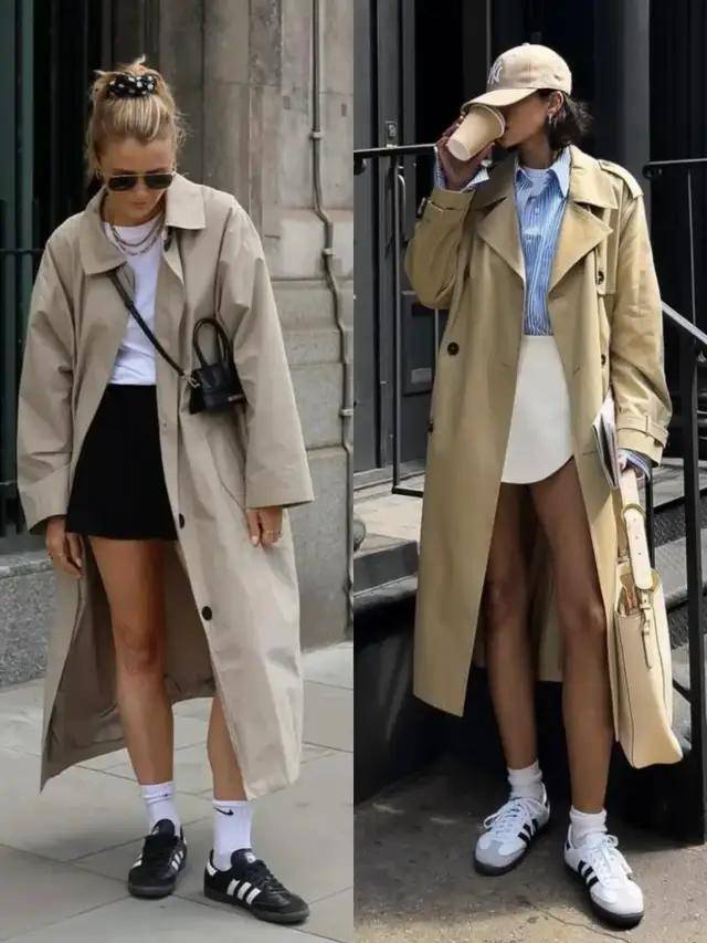 天气回暖,想呈现自己的好身形,试试下衣失踪穿搭方案,选择一件卡其色的风衣外套,内搭白衬衫,配上同色系的短裙,脚踩经典款式的德训鞋,利落显腿长。