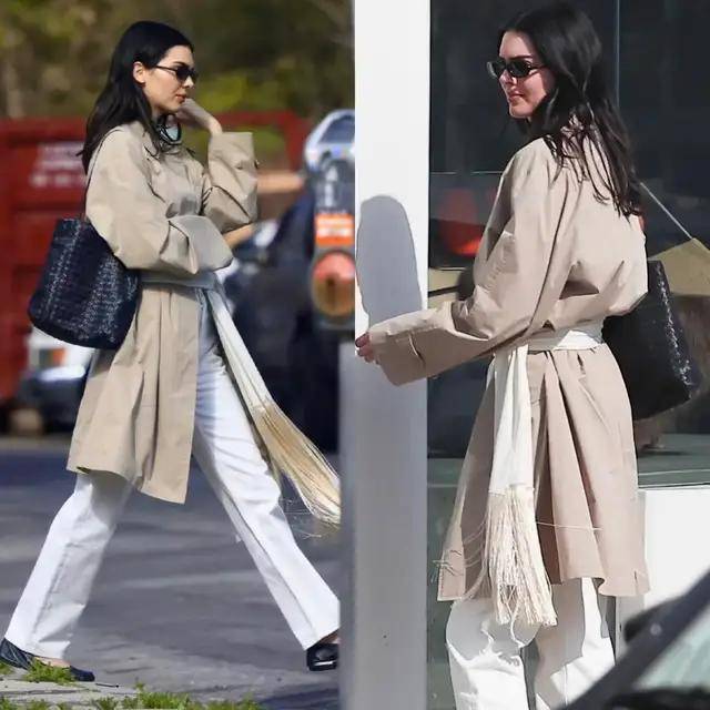 换成白色西装阔腿裤,加上白色衬衫,再配上卡其色风衣外套,干练利落。这样的穿搭大步向前,满是藏不住的自信与潇洒。