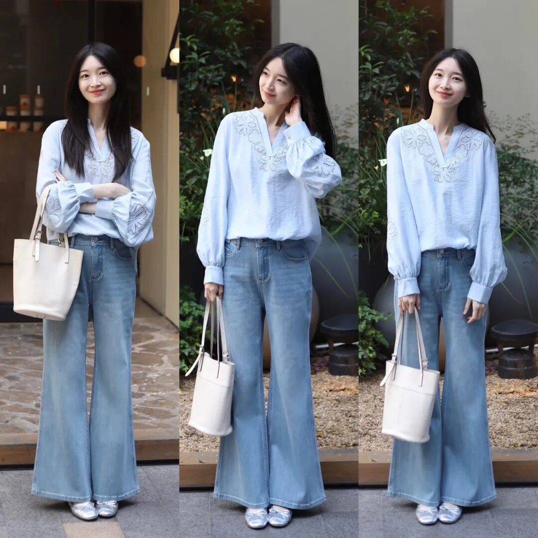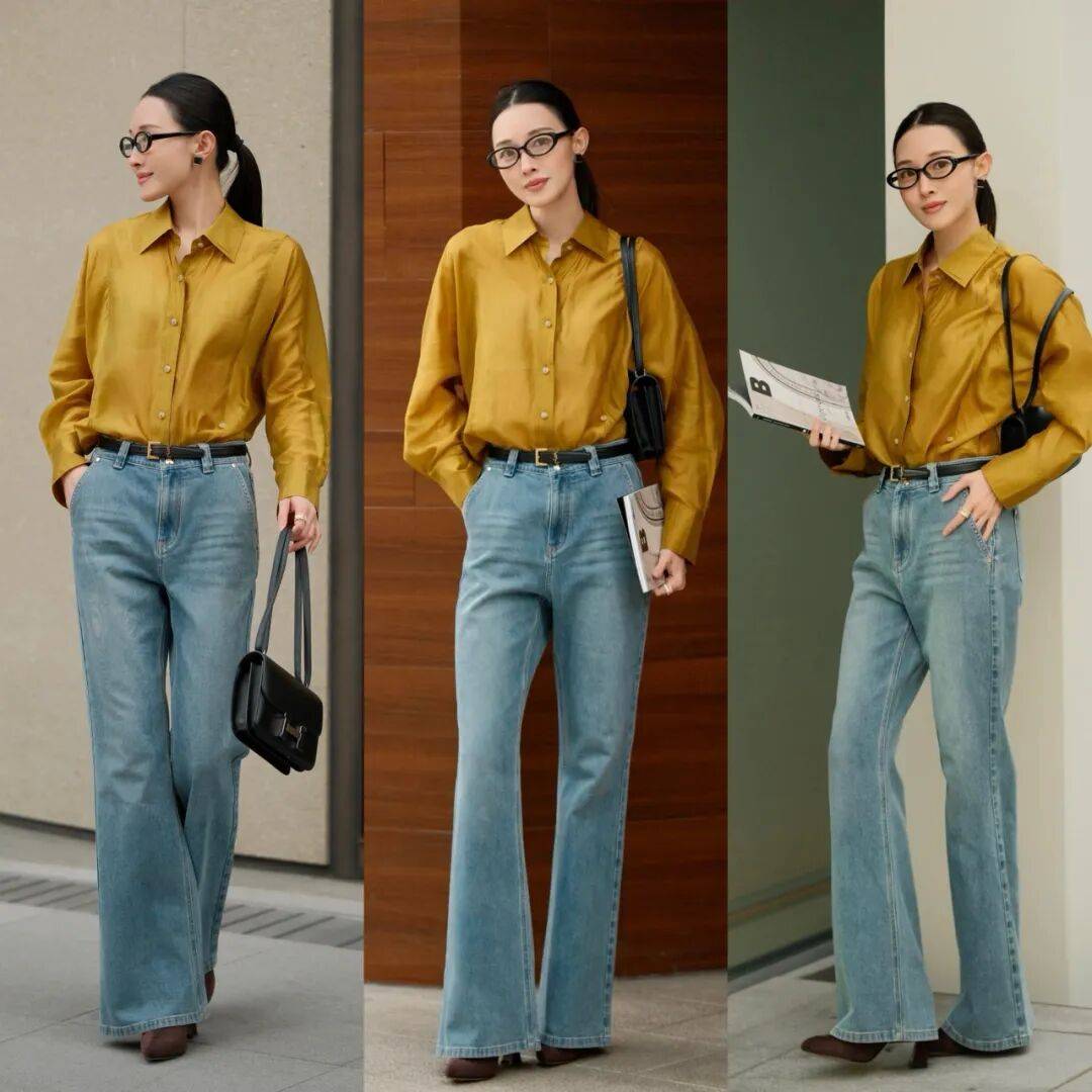 身材高挑纤瘦。但不想让自己的穿搭过于干瘪。可选一条微喇叭的蓝色牛仔裤,上衣是一件姜黄色的衬衫,同时衬衫的款式也是微宽松,穿的时候把它塞进牛仔裤的裤腰里,勒上黑色腰带,高腰线立刻显现,整个人显得很有精神,复古又时髦,这样的打扮方案日常出街很抢眼。
