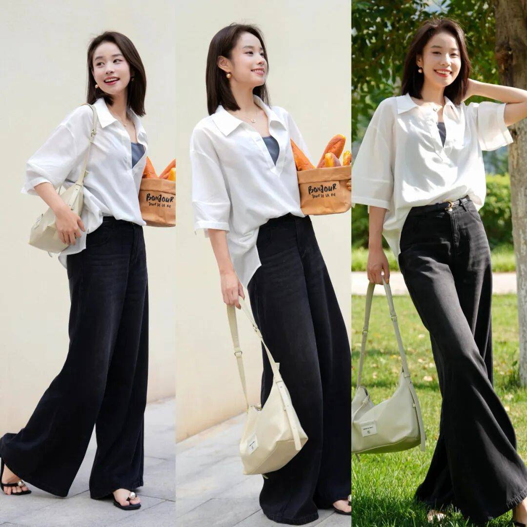 例如上面这 3 套穿搭,都选择了微宽松的衬衫,穿时把衬衫一角塞进裤子里面,就能形成高腰线。