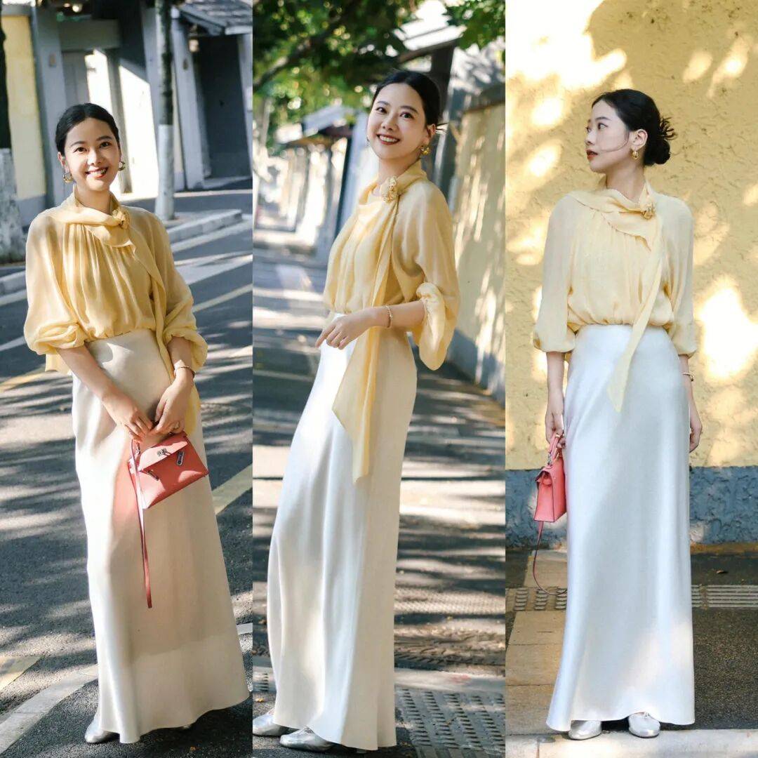 Tips③:鹅黄色雪纺衬衫+直筒半裙