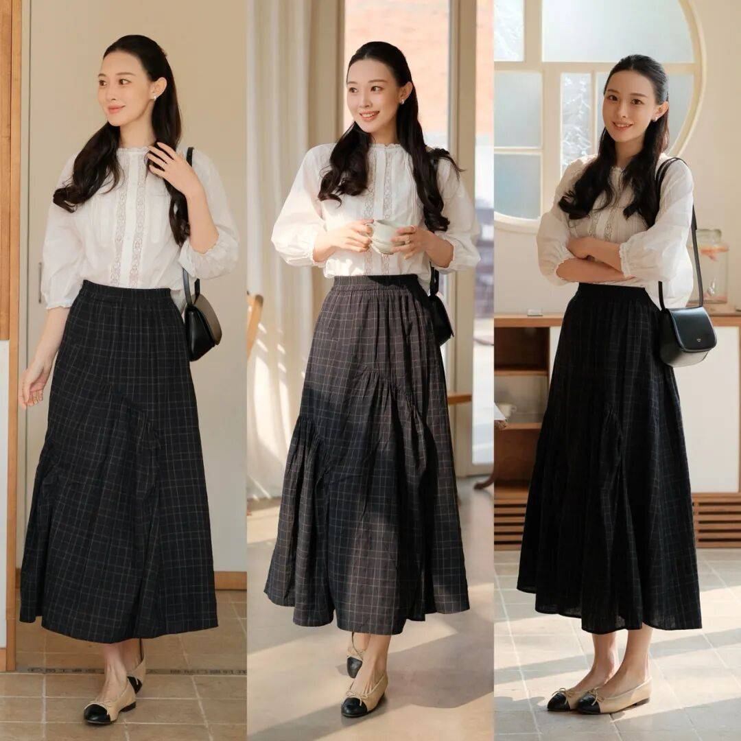玛丽珍鞋穿在脚上能让女性变得更加温柔甜美,例如上面用黑色和卡其色拼接的玛丽珍鞋,配上一条格纹的高腰收腰 A 字半裙,配上白色的微宽松小中衬衫,结合优雅大气的波浪卷发造型,就能让你轻松 get 到小姨风的穿搭气质,时尚又高级。
