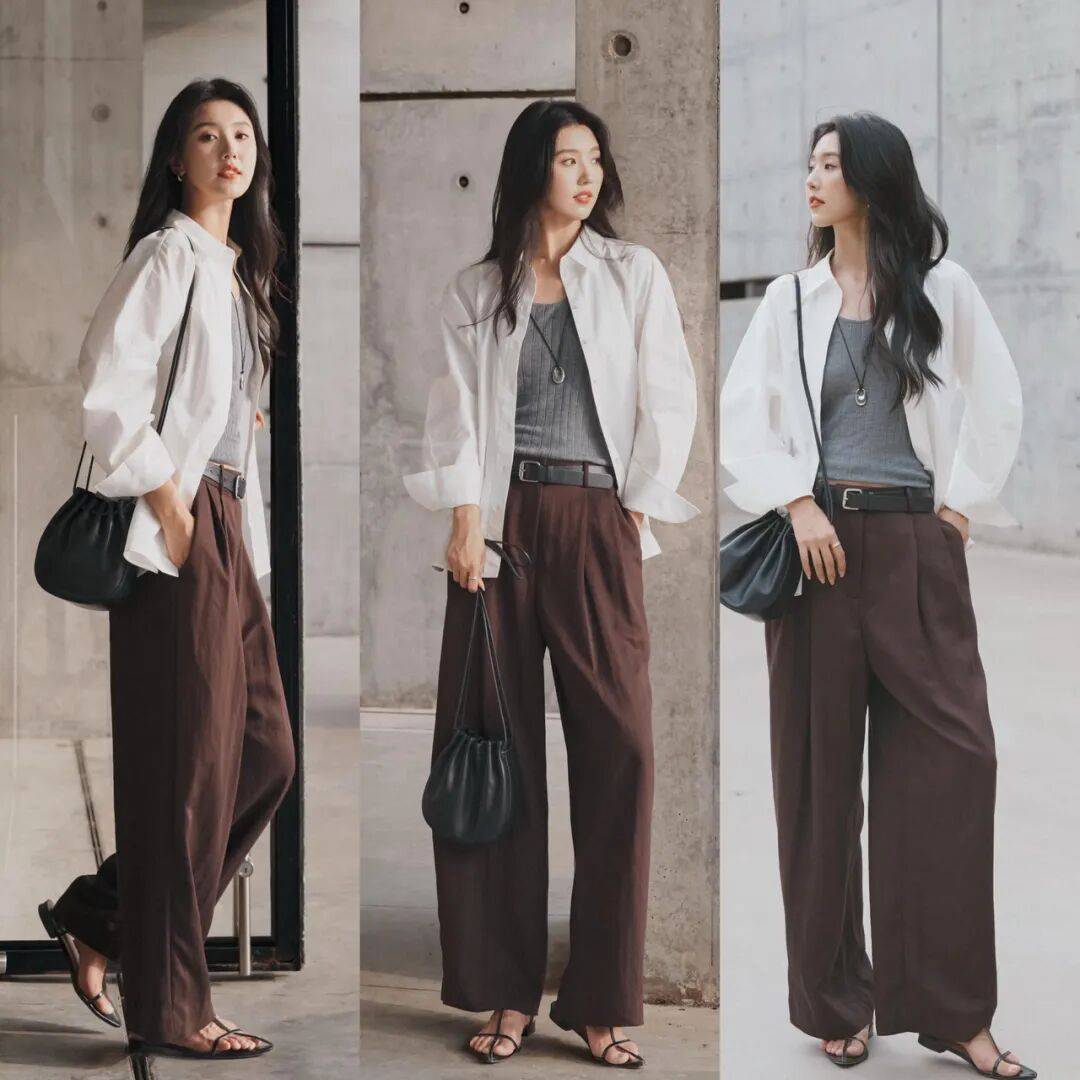 在这个春天,若是让自己的穿搭更显利落又不呆板沉闷,可选白色衬衫内搭灰色针织衫和一条棕色的西装直筒阔腿裤,脚上穿的一双黑色凉鞋,刚柔并济,打扮更有层次感,同时能让人眼前一亮。