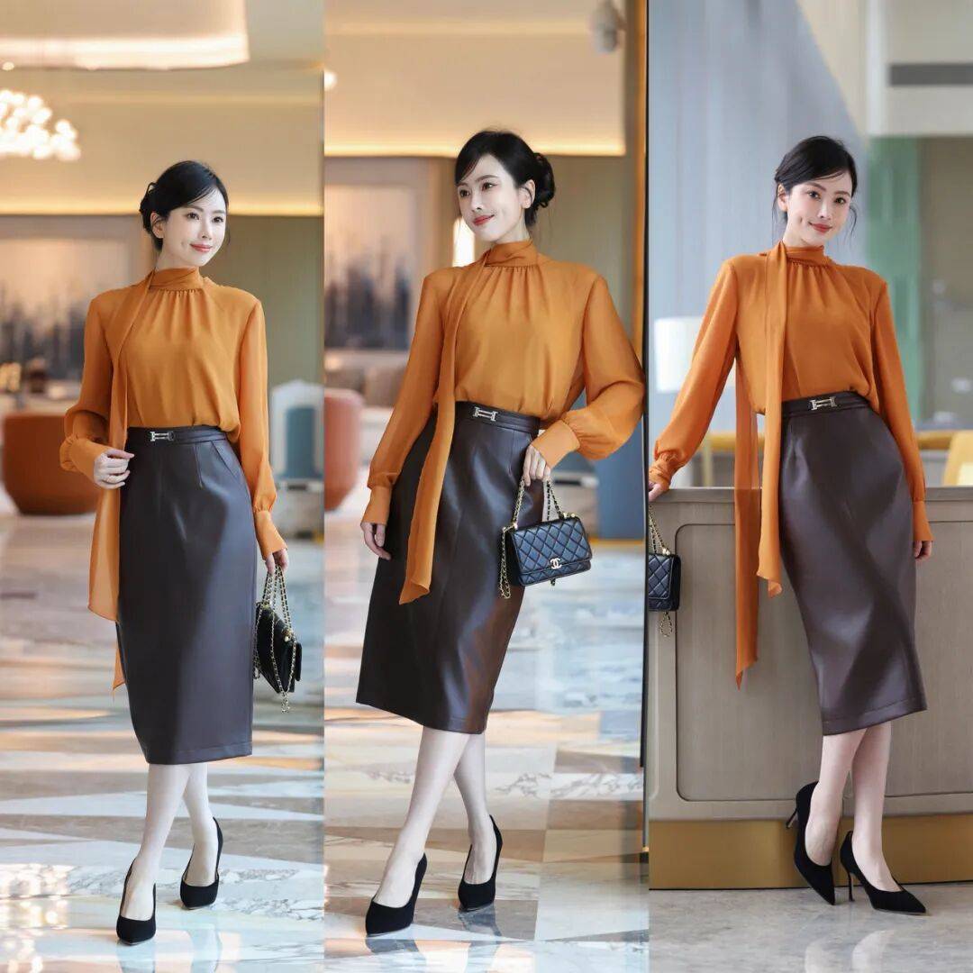想让自己的衬衫裙装穿得更别致,不妨换成一件南瓜黄的雪纺小众衬衫,配上皮质的棕色直筒半裙,脚踩黑色浅口高跟鞋。这样的配色沉稳大气。飒爽与柔美平衡得恰到好处。能够使得穿搭者又飒又优雅。