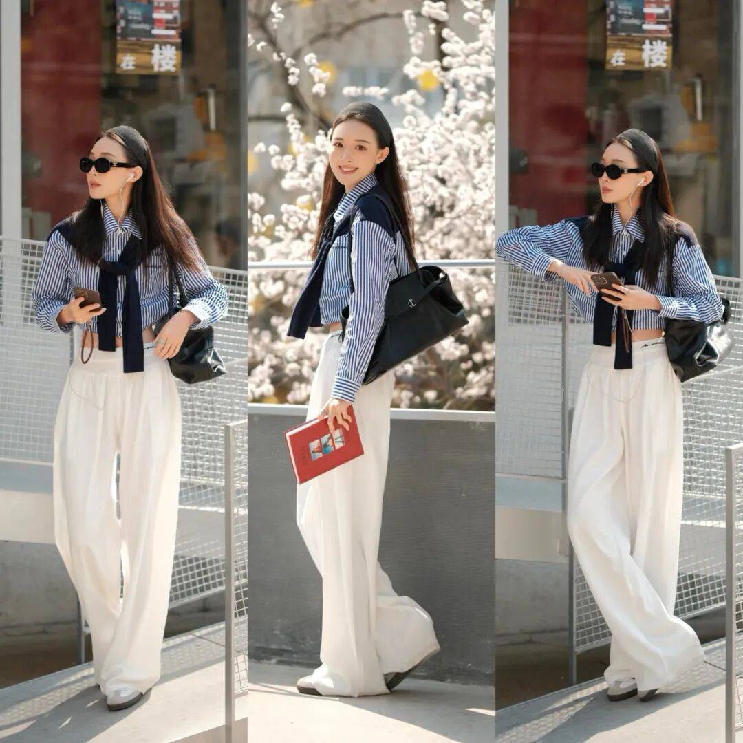 我们还能换成一条休闲的白色阔腿裤,面料垂坠感十足,穿在身上就能呈现一种慵懒感。再搭配上条纹的短款衬衫,形成露腰穿搭,让身材变成三七分比例,显高显瘦,随性又精致。