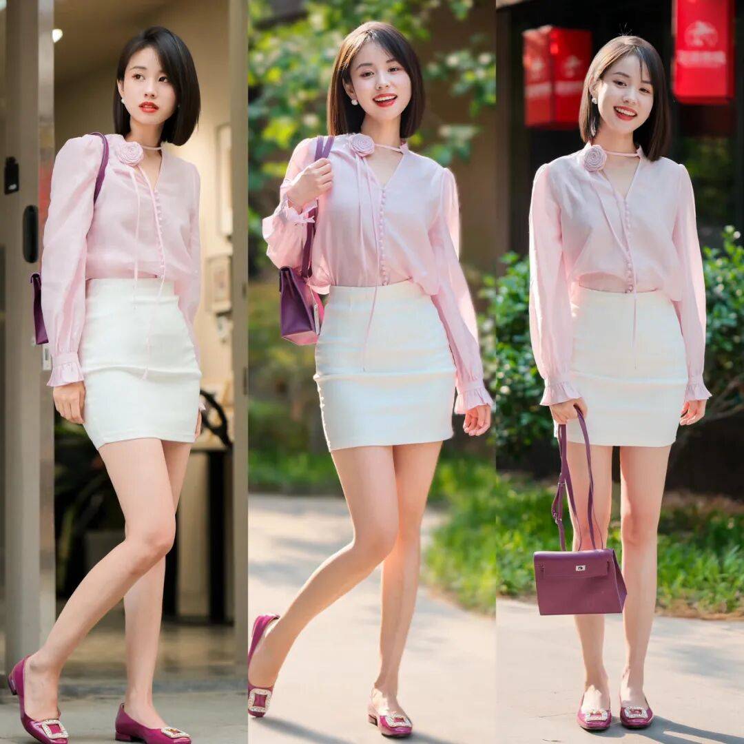 在这个春季我们的穿衣造型就是要活力感满满。那么我们不妨直接选择粉色的小众衬衫,配上一条高腰收腰的白色直筒短裙,少女气息自显。