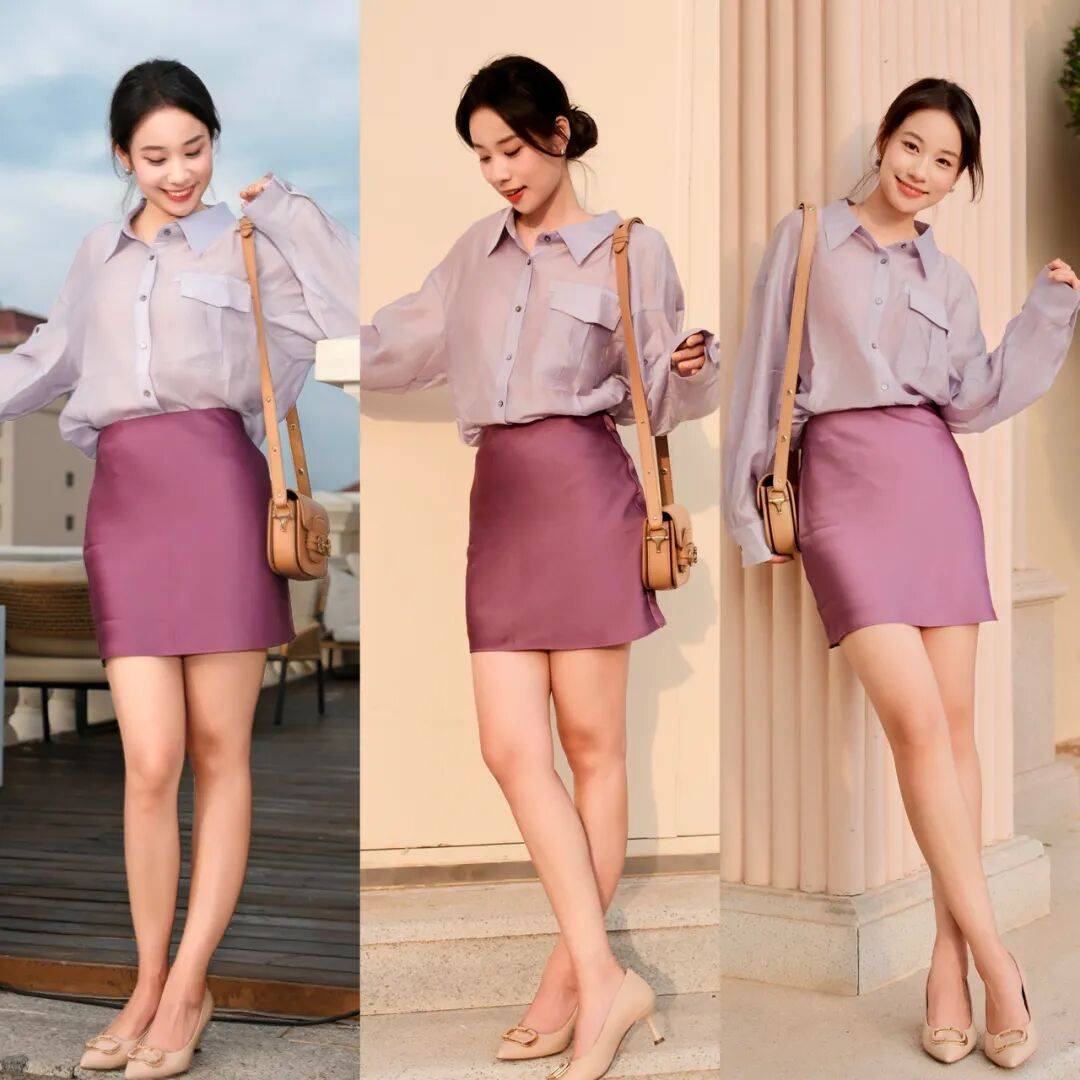 偏爱优雅感的穿衣风格,换成一件蓝紫色的小众衬衫,配上紫色的直筒短裙,脚踩一双杏色的浅口高跟鞋,这样的打扮技巧属于下衣失踪穿法,能更好地呈现大长腿的优势,让你轻松拿捏春日优雅感穿搭。