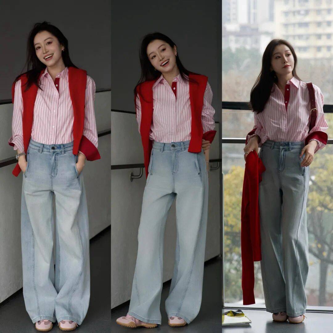 上衣选择一件粉色条纹衬衫来组合,正好和粉色的德训鞋形成色彩呼应,这样的穿搭不张扬不喧哗,简单耐看,少女感扑面而来。