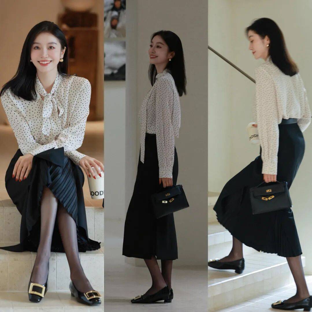 选择鞋子的时候,尽量选择低跟的款式,像上面这一双黑色的粗跟低跟单鞋,搭配上黑色的百褶半裙和黑白波点雪纺衬衫,黑白搭配经典又耐看,造型层次丰富也显得高贵轻盈灵动,照着穿也可以秒变成气质女神。