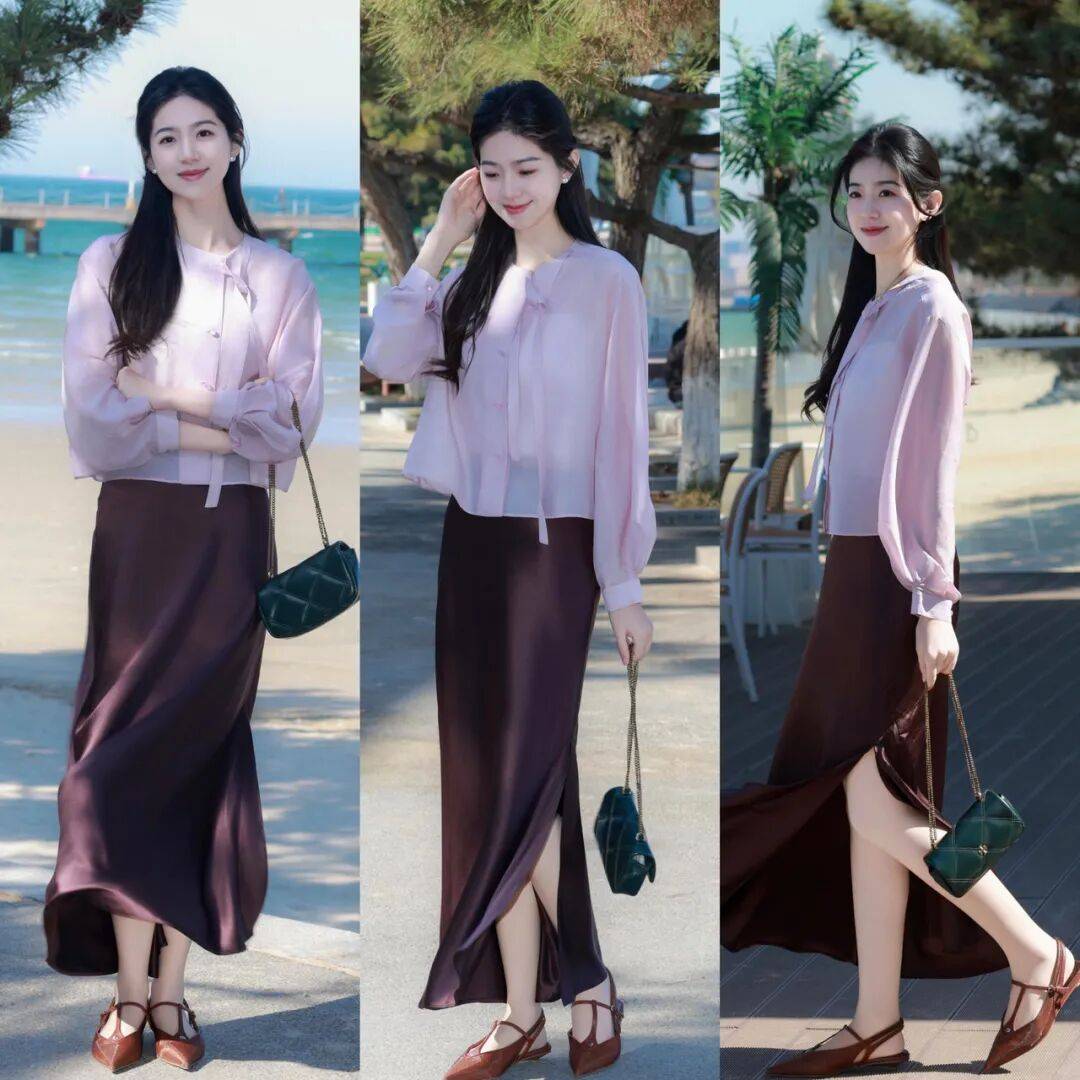 咱们若是想让自己的穿搭更高贵又显年轻,不妨选择自带少女感的粉色小众衬衫,配上真丝面料的棕色直筒半裙,上身之后就显得比较贵气,又不失少女的轻盈俏皮感。