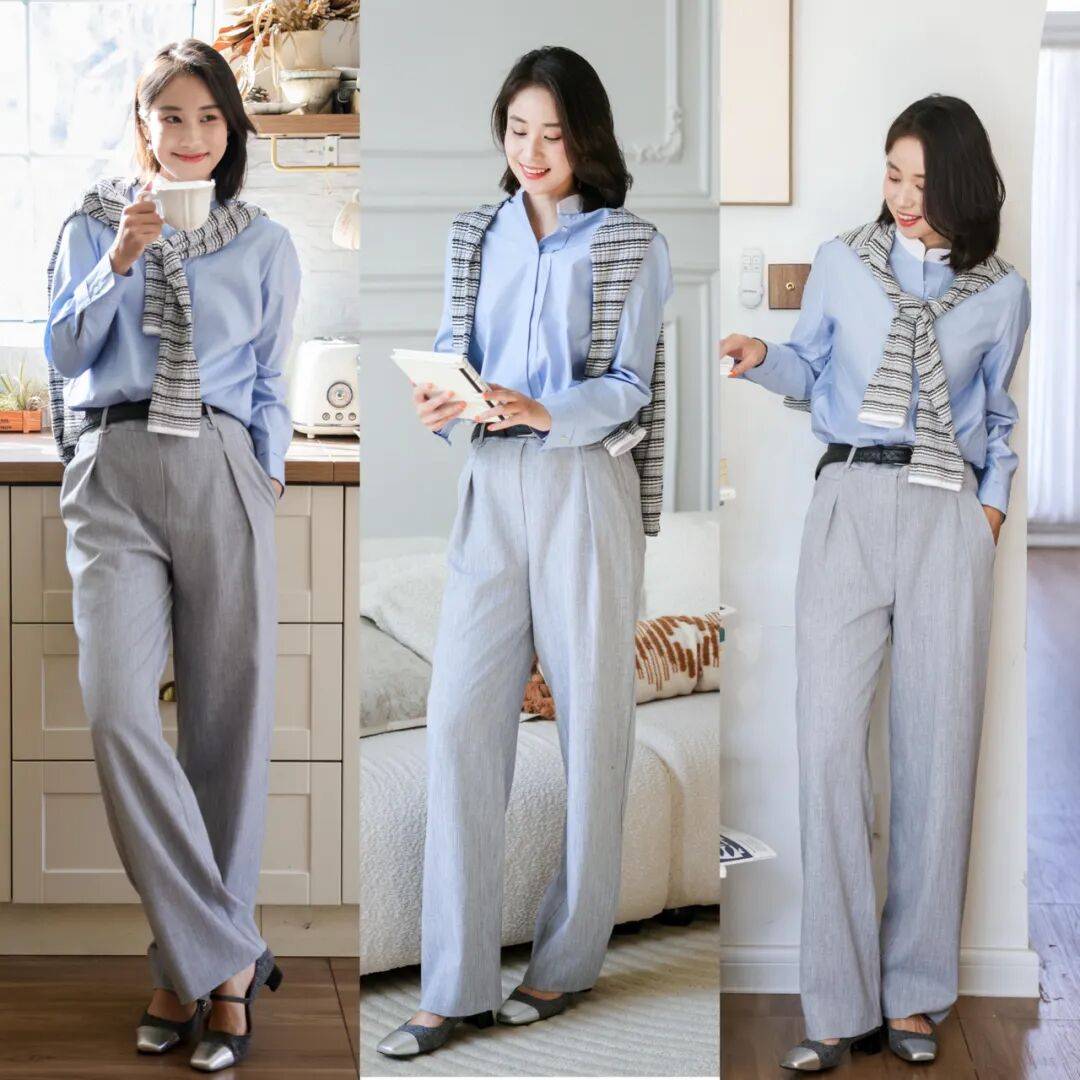 蓝色的衬衫天生就拥有时尚元素,穿在身上让你瞬间 get 到时尚感,可配一条灰色的西装裤,脚踩拼接式的粗跟单鞋,这样的配色让人看起来更显年轻,日常通勤穿搭都适配,就算是穿出门去约会都完全没有任何问题。