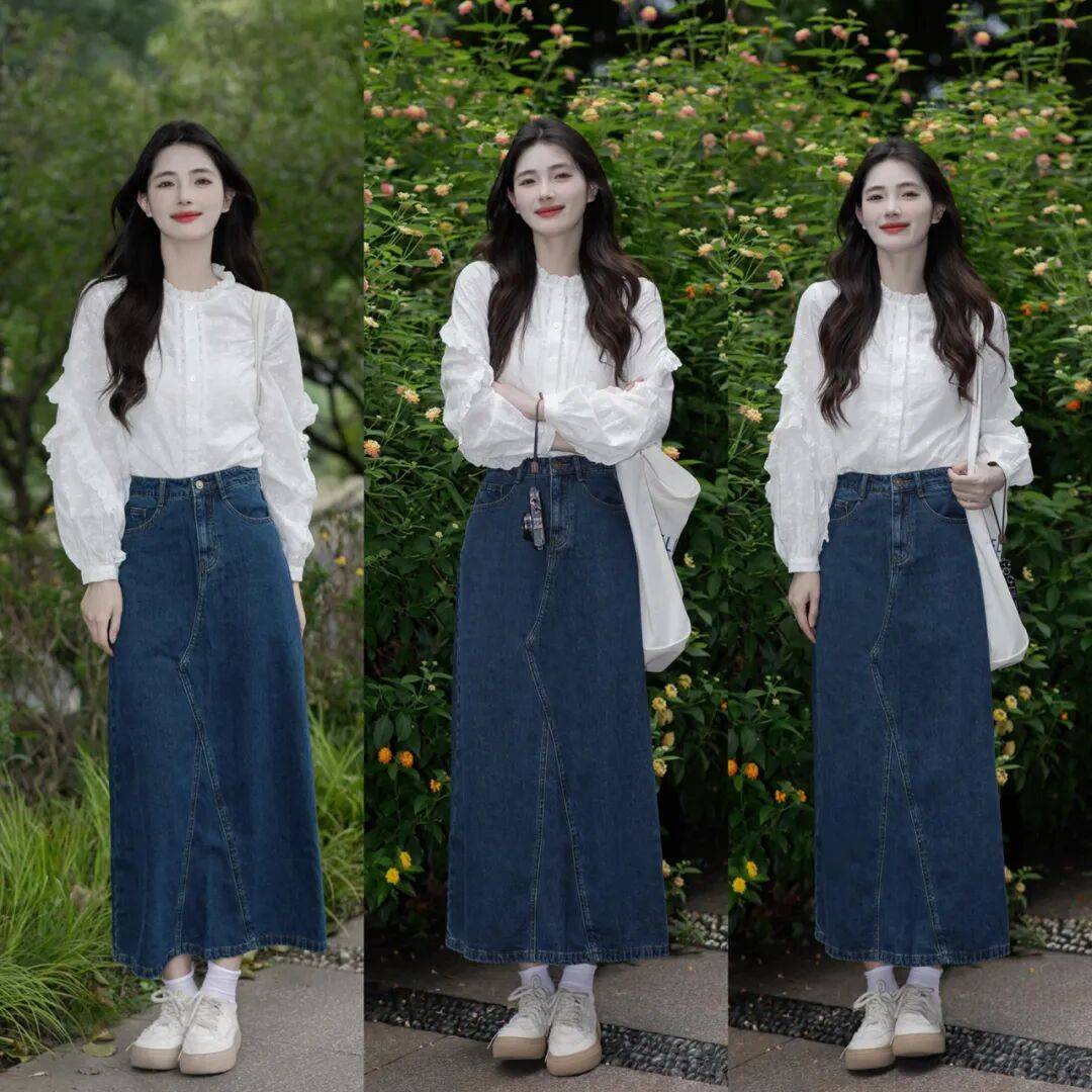想要把衬衫和裙子穿出不一样的气质,我们可以选择小众的白色衬衫配上蓝色的牛仔直筒半裙,这样的穿搭可盐可甜。