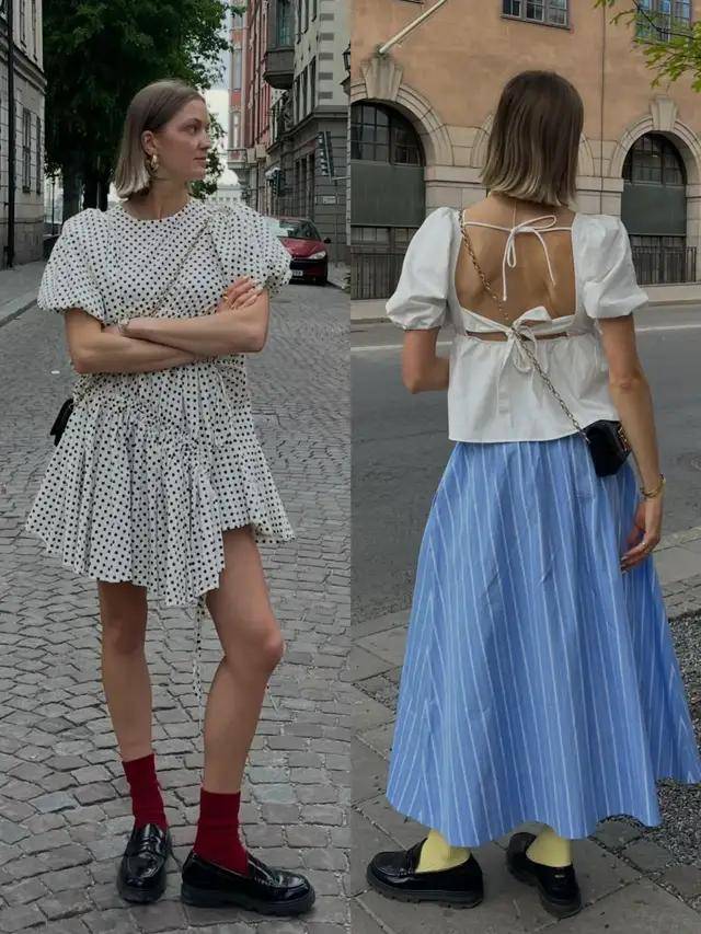 或是选择灯笼袖白衬衫搭配高腰收腰蓝色条纹 A 字半裙,脚踩黑色皮鞋,露背设计的小衬衫确实给造型添加了一点小性感,既温柔又优雅,日常通勤穿搭都很出彩。