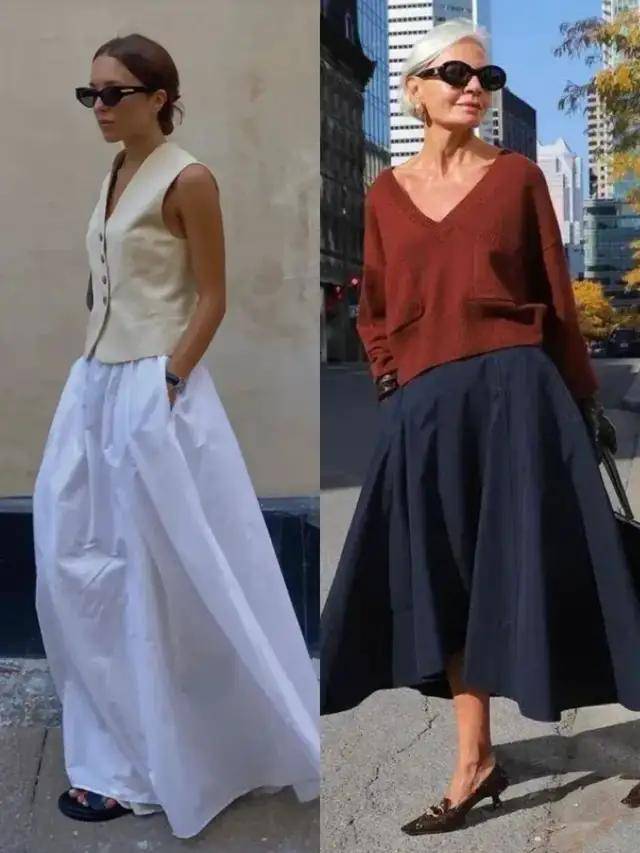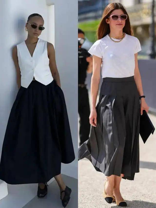 或是选择白色马甲搭配黑色高腰伞裙,脚踩黑色单鞋,利落又大气。