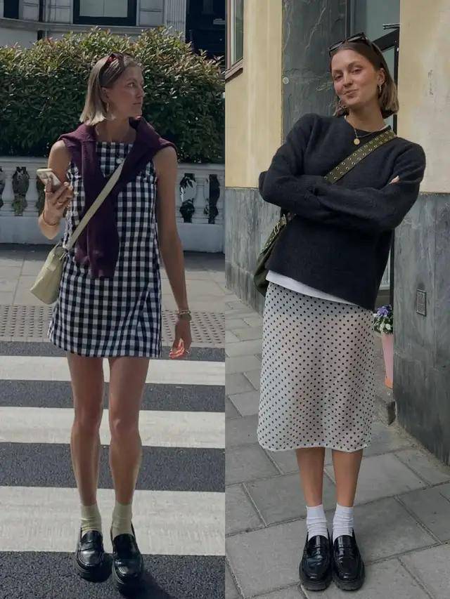 不同的裙子有着不一样的穿法,同样也要考虑身材比例来决定若高挑纤瘦,拥有修长笔直大长腿,可选一条黑白格纹连衣裙,配上黑色乐福鞋就够。