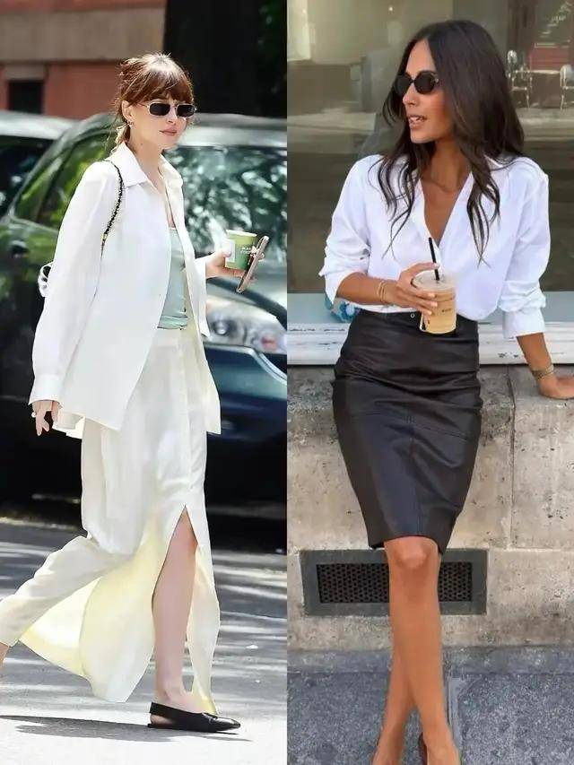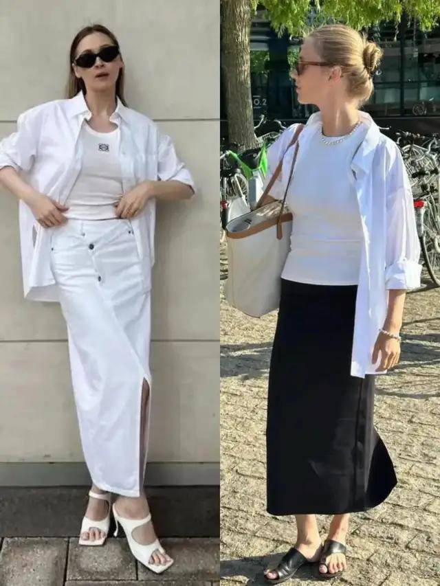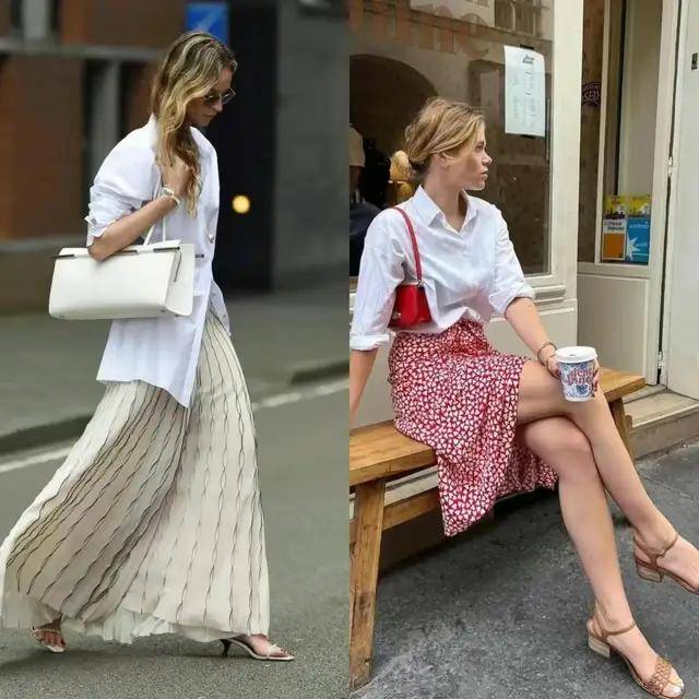 或是选择蓝色衬衫配上高腰收腰的白色伞裙,穿时把衬衫一角塞进裙子里,可以形成高腰线,这样的撞色搭配让整体配色更有层次感,温柔大气。