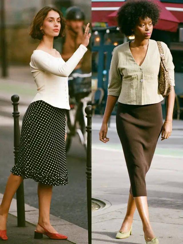 当然,若是不喜欢穿短裙,或是有点胯宽腿粗,我们还可以选择薄款的波点直筒半裙,配上灰色针织毛衣,叠穿白 T 恤,温柔又有层次感。