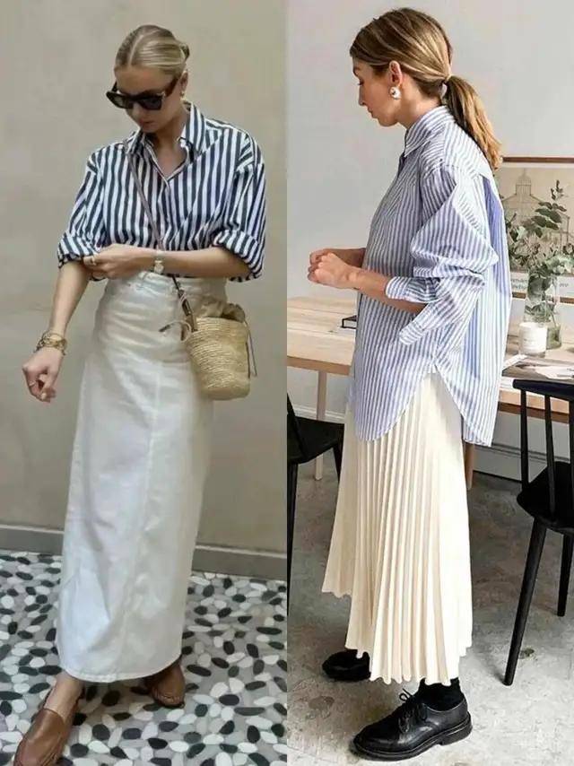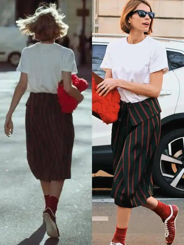 日常穿搭我们想要休闲感,可选条纹直筒半裙,配上最经典的白色短 T 恤,脚踩红色平底鞋,这样的穿衣造型,日常通勤上班或者是约会逛街,出门旅游拍照都适配,简约利落又高级洋气。