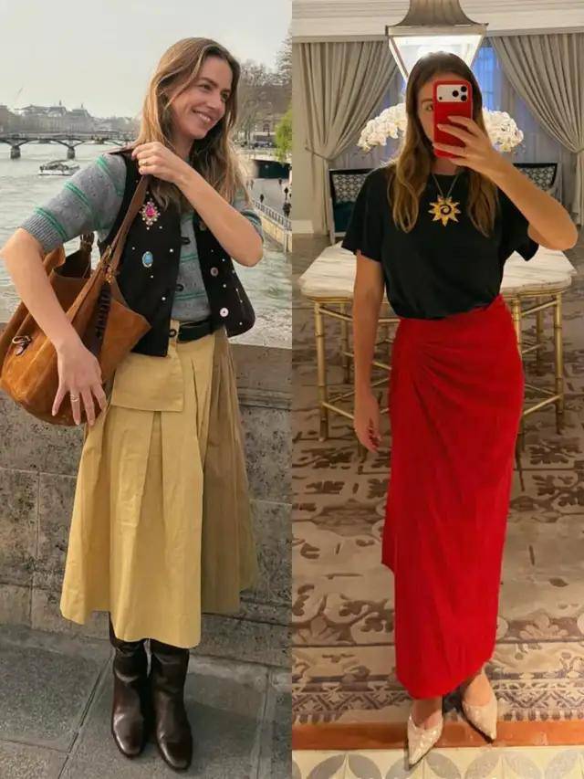 但我个人更推荐选择过膝裙,裙长卡在小腿的位置,适当的露出一点肌肤,更不容易压个子,也不显得拖沓邋遢,衣着留白,留下的是恰到好处的呼吸感。
