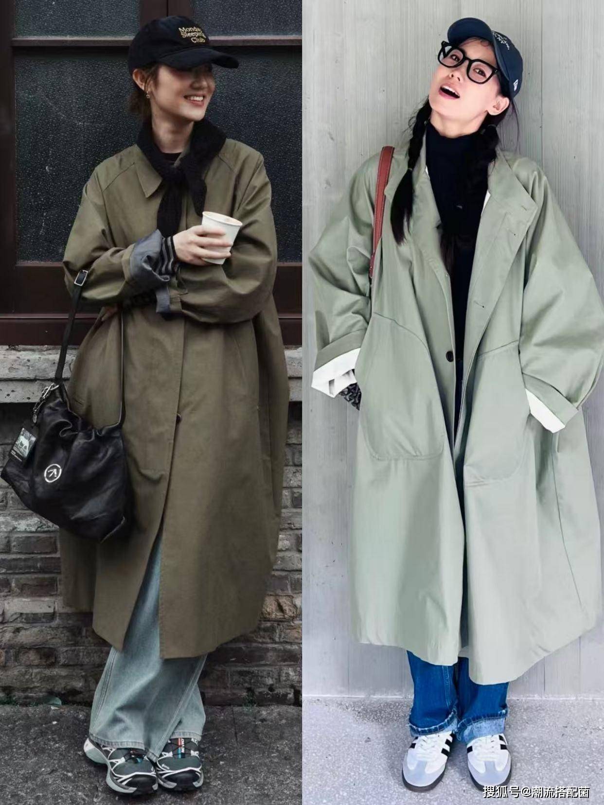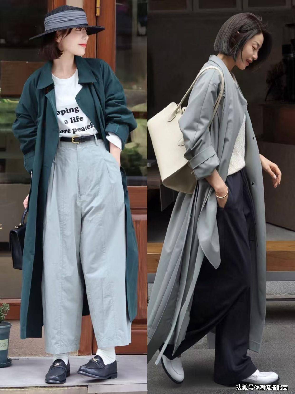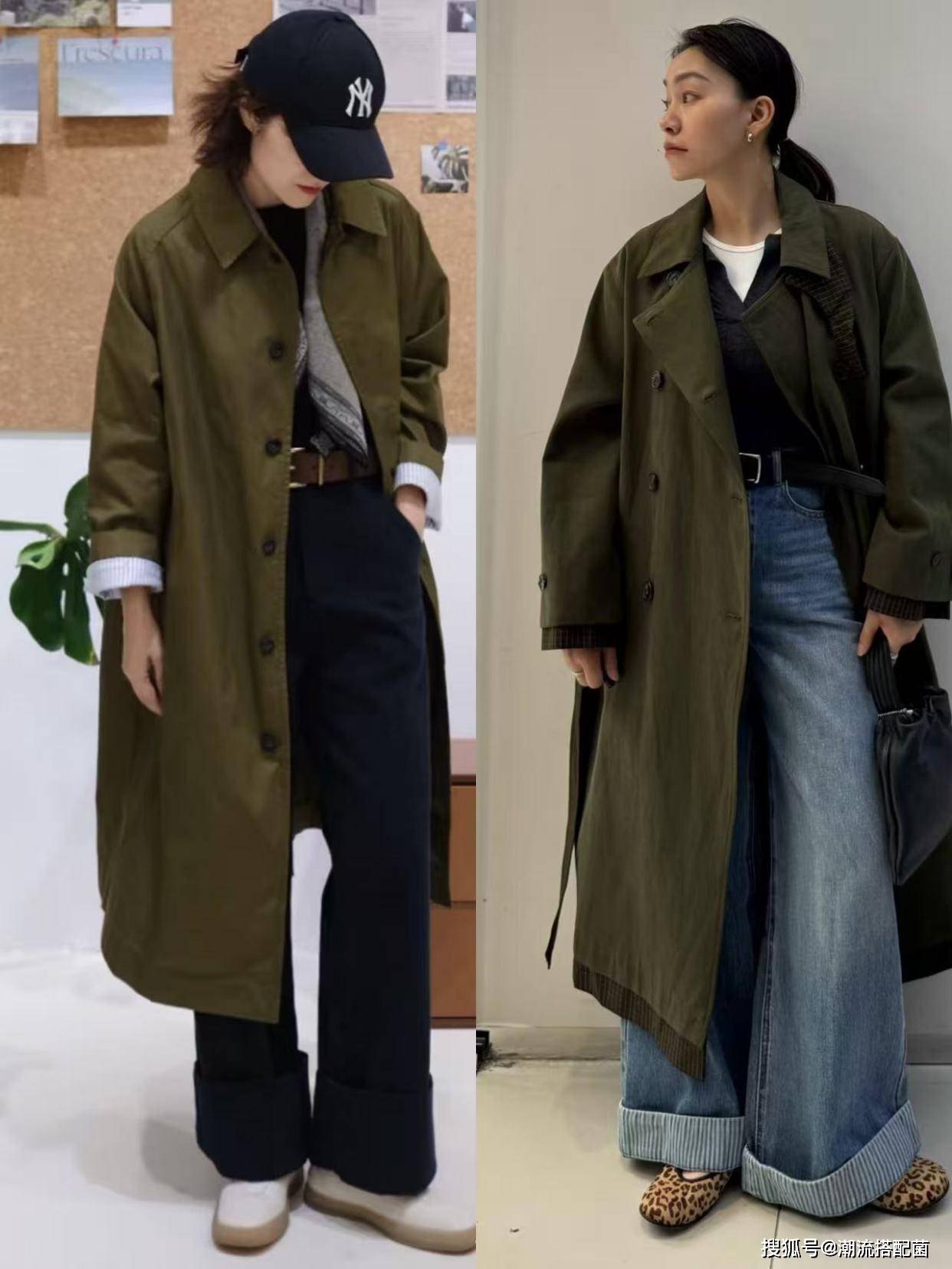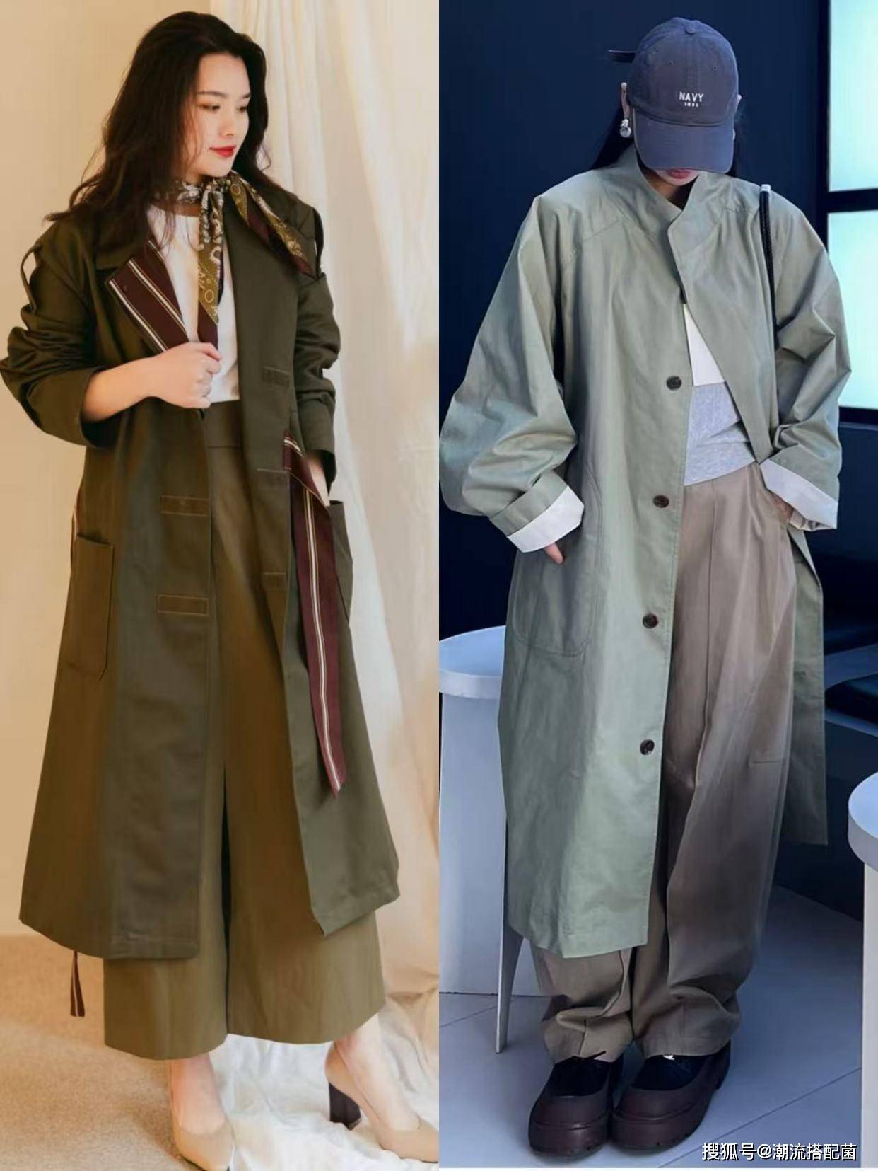 草木绿风衣+阔腿裤