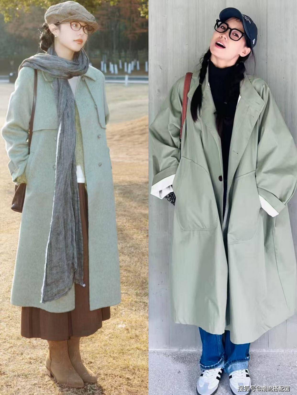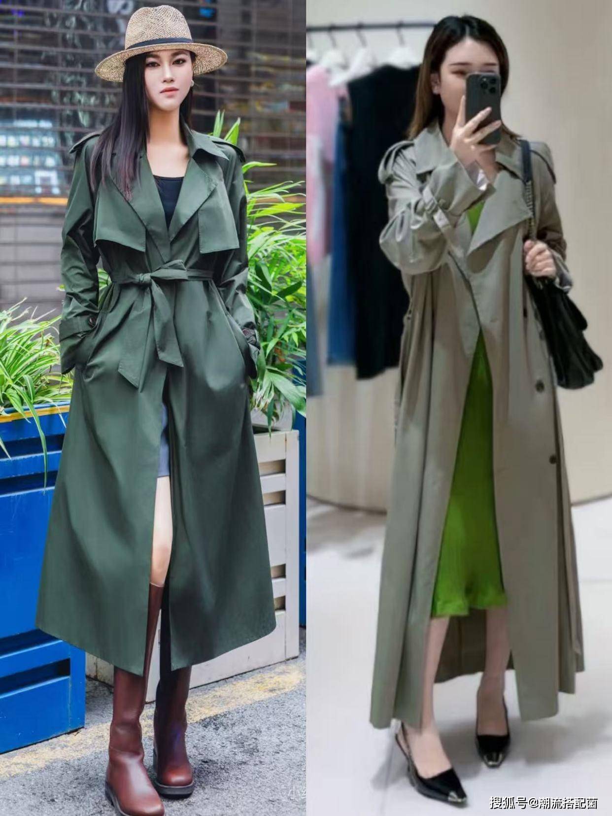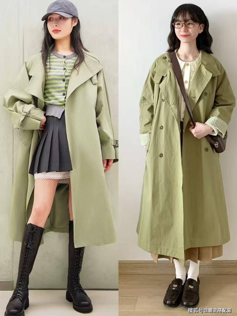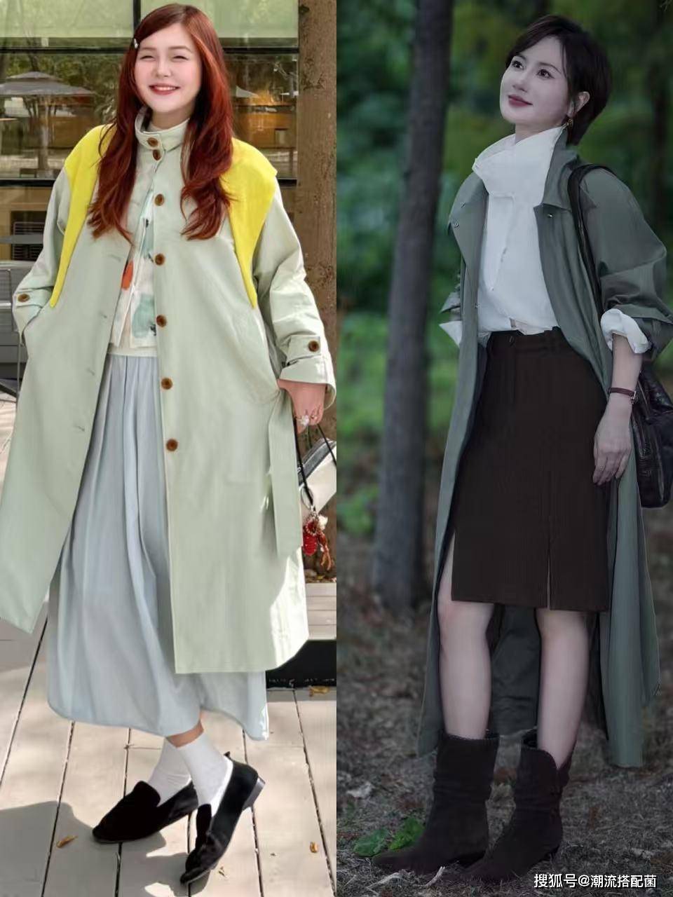 草木绿风衣+半身裙