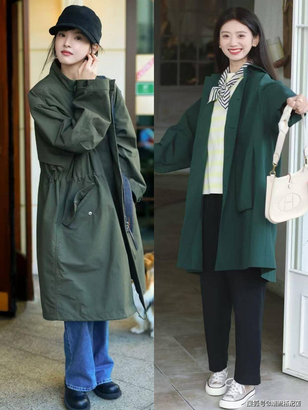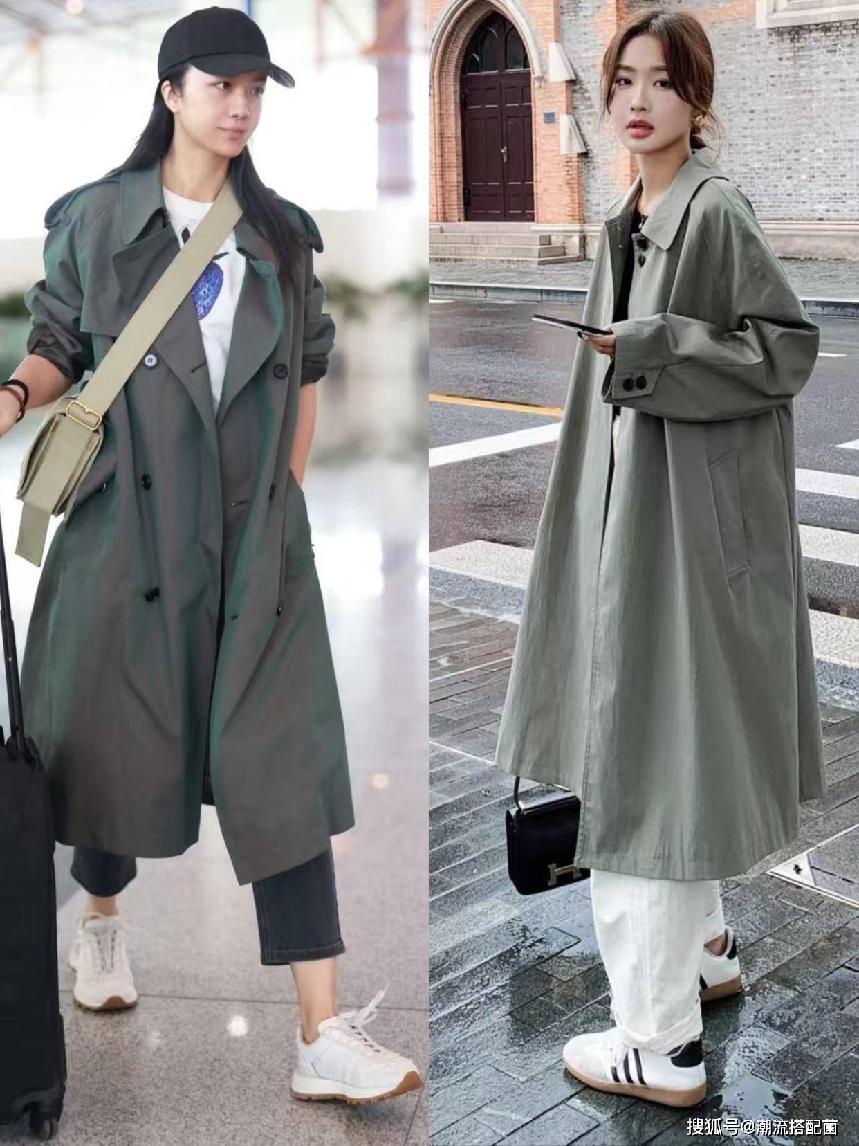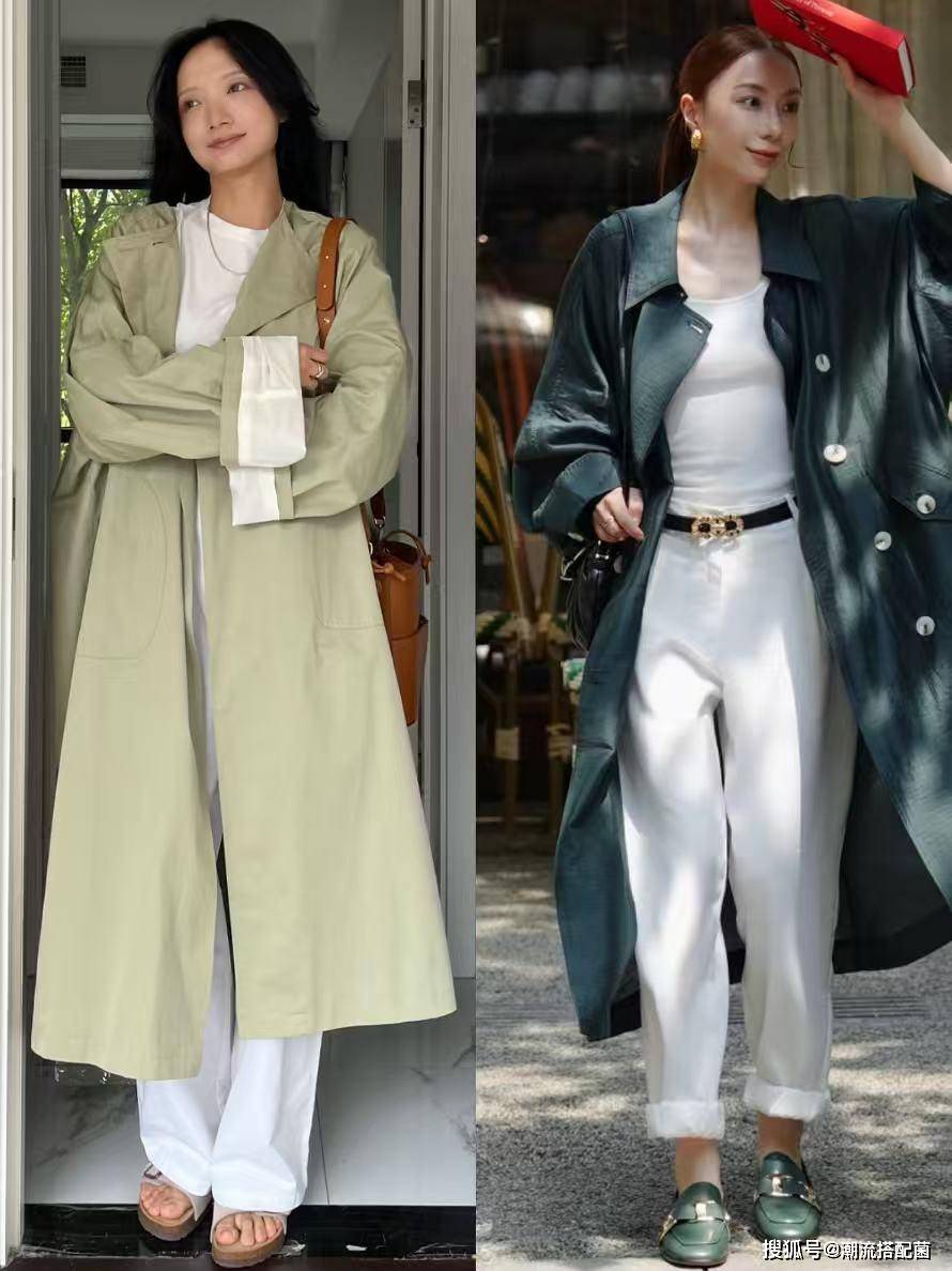 草木绿风衣+小白裤