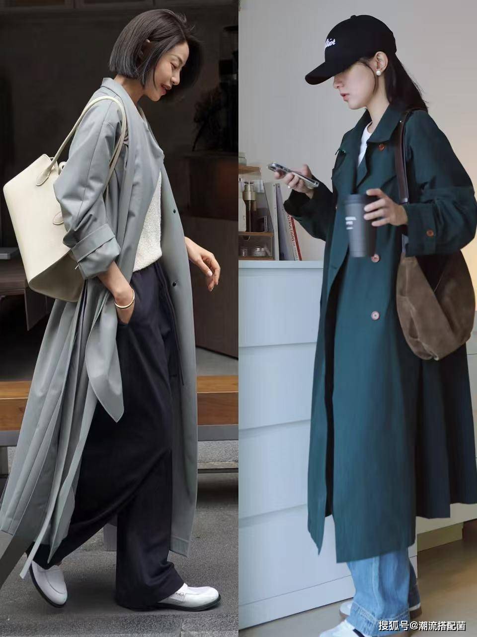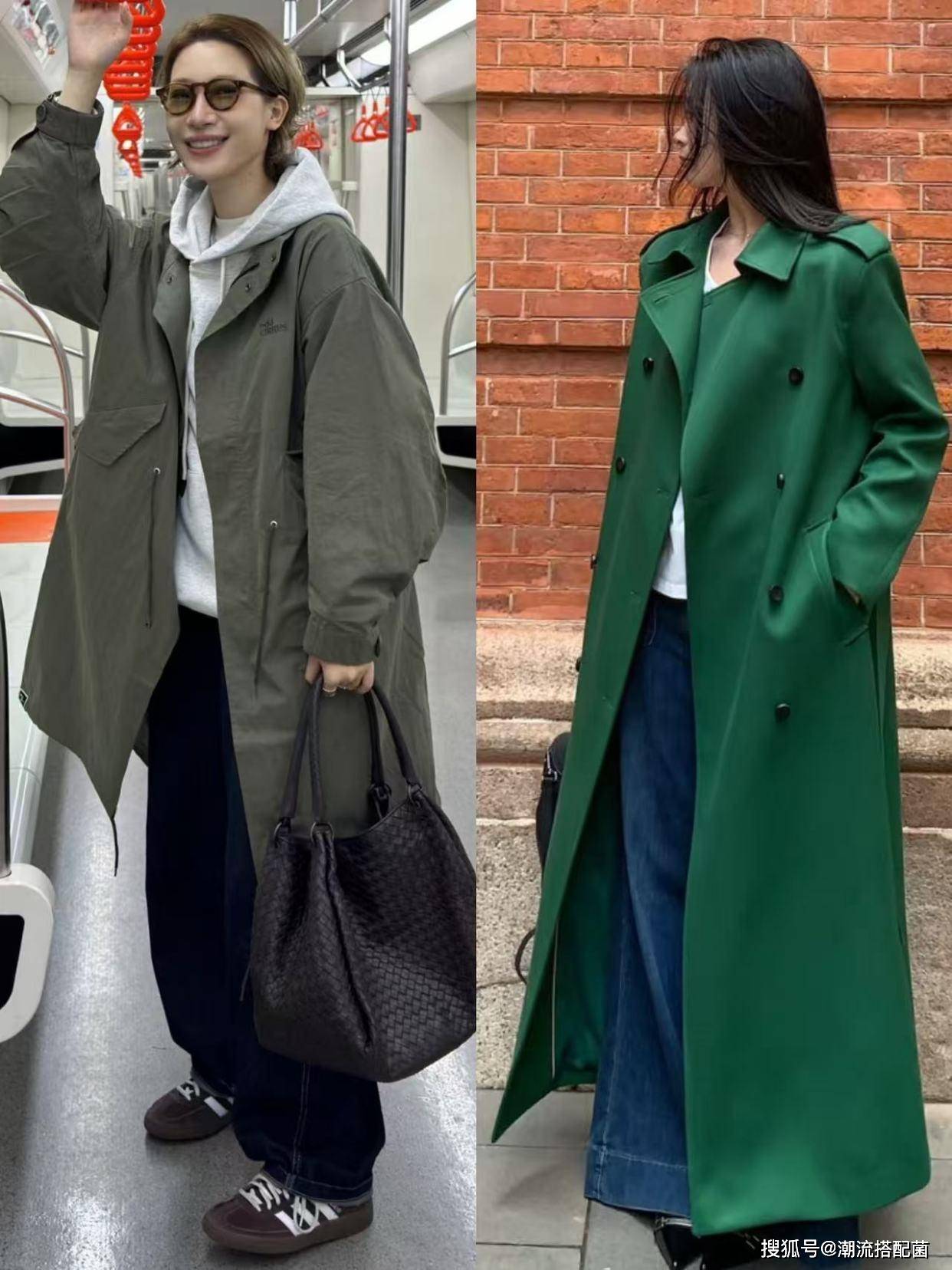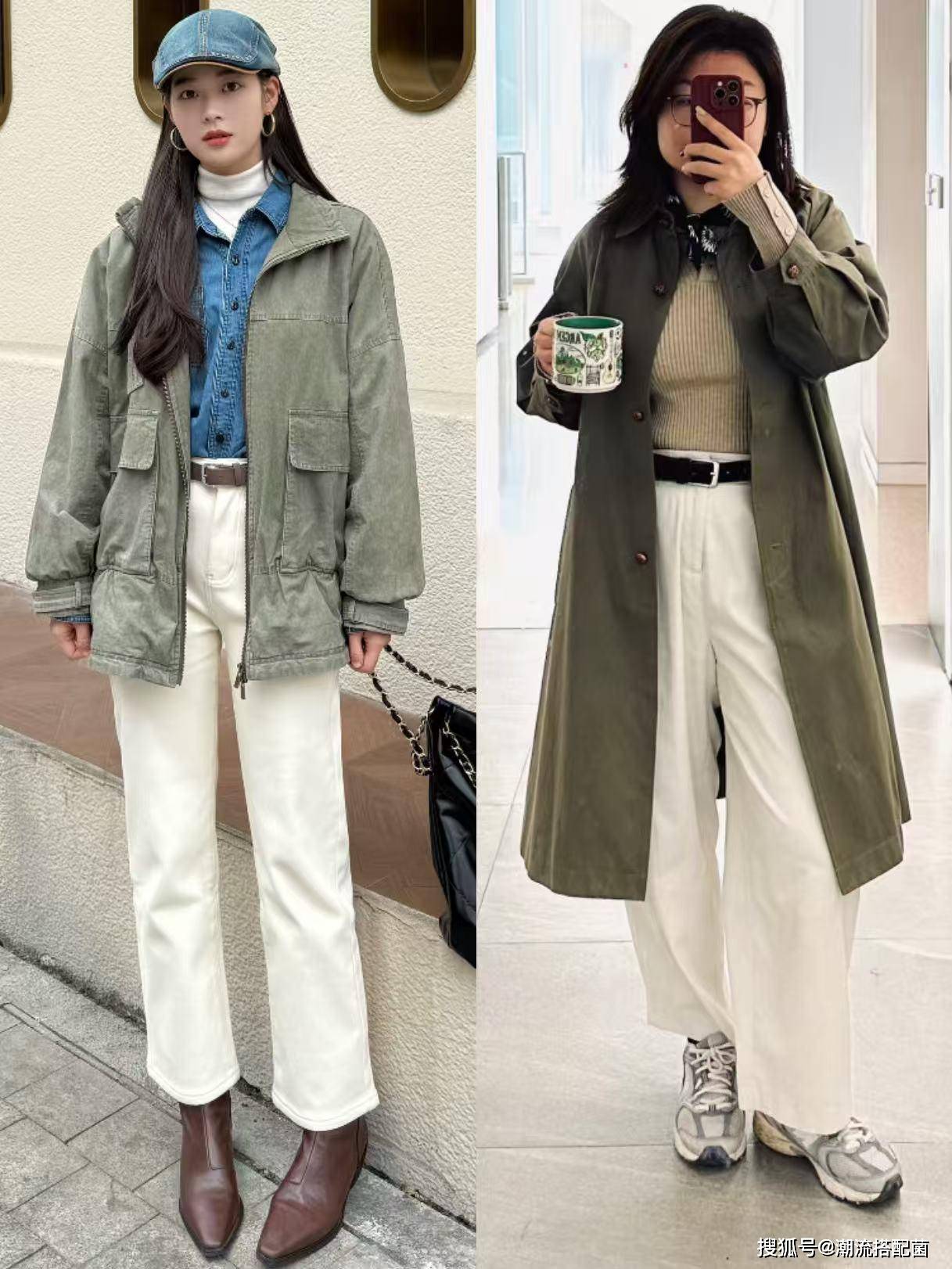 草木绿风衣+小白裤